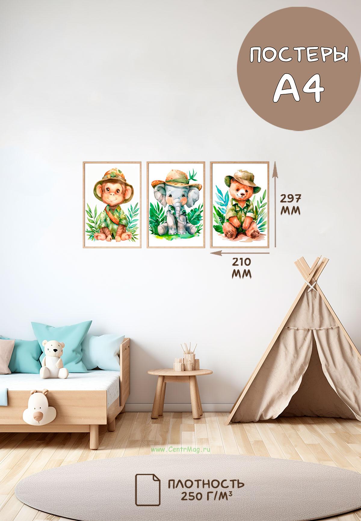 Постеры детские (А4, джунгли, жираф, зебра и сурикат, 3 шт) (130 руб.)