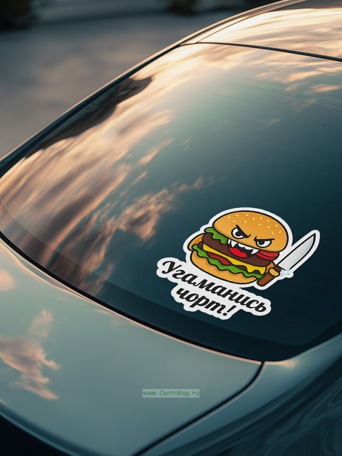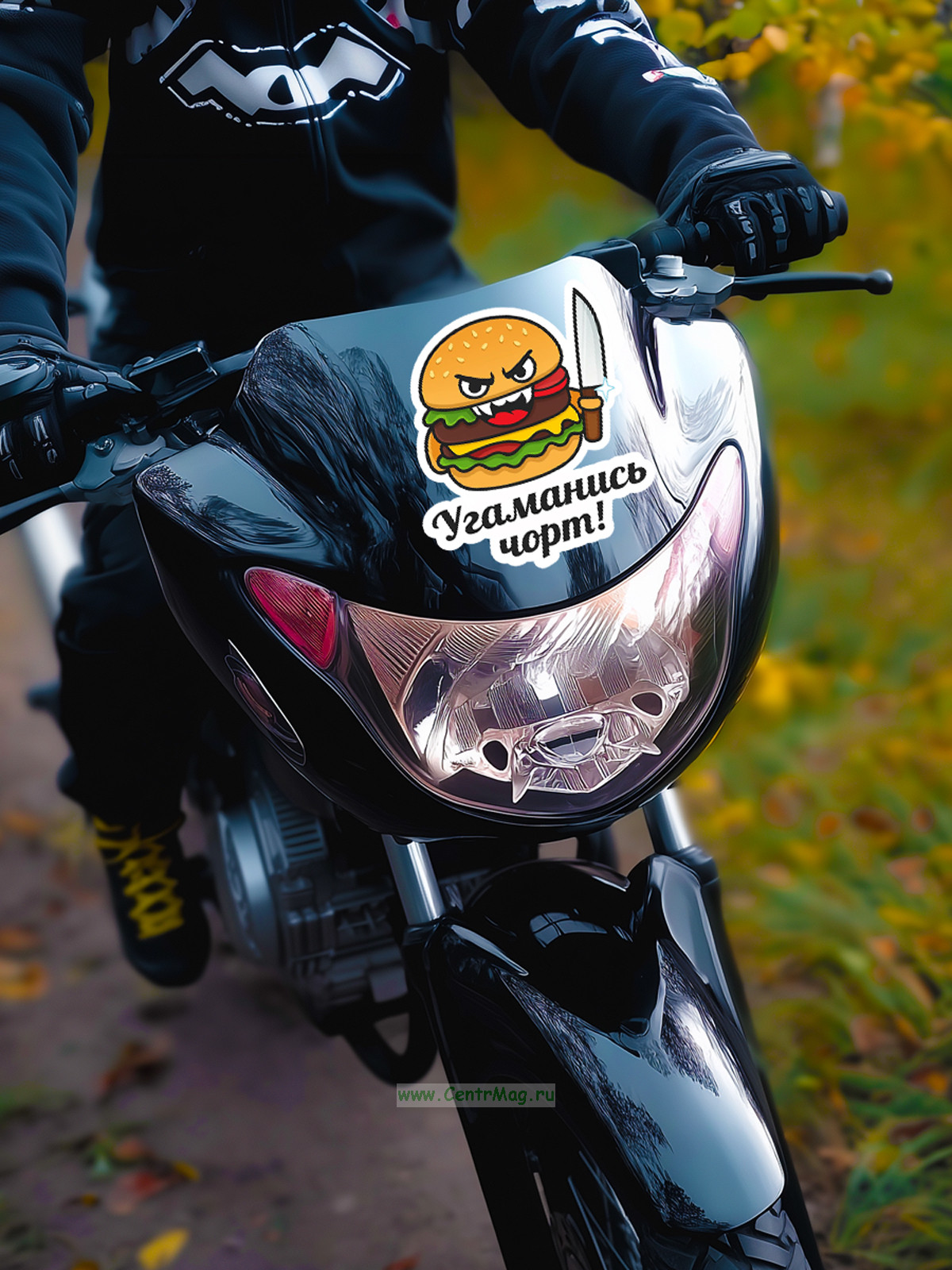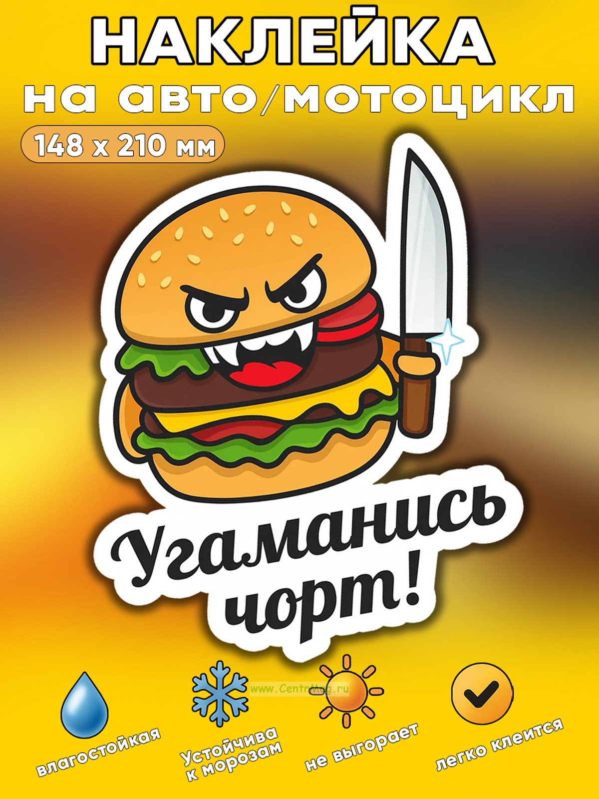 Прикольная наклейка "Угаманись чорт" (злой бургер), А5