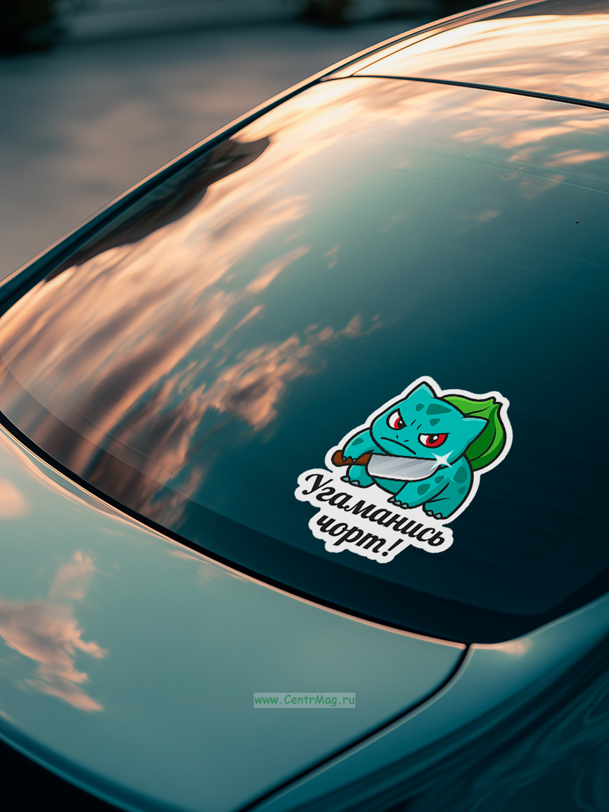 Прикольная наклейка "Угаманись чорт" (злой динозавр), А5