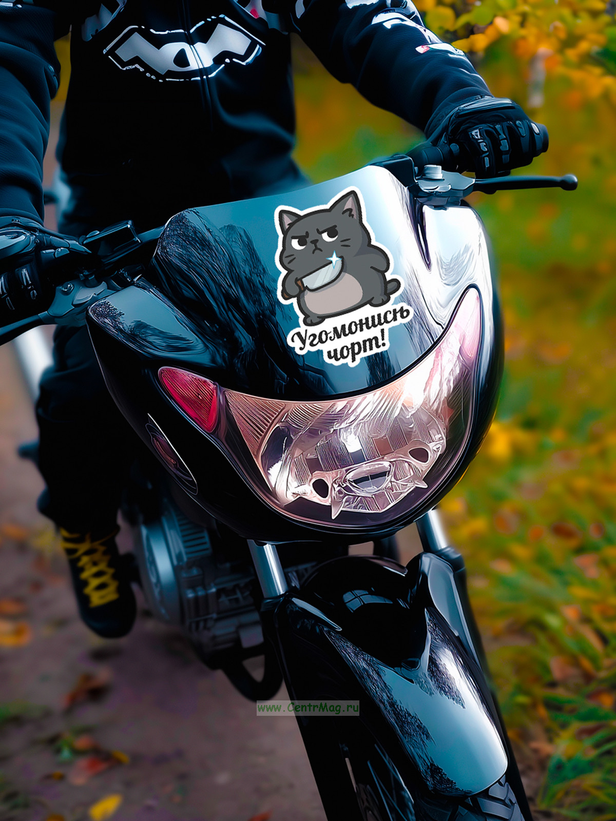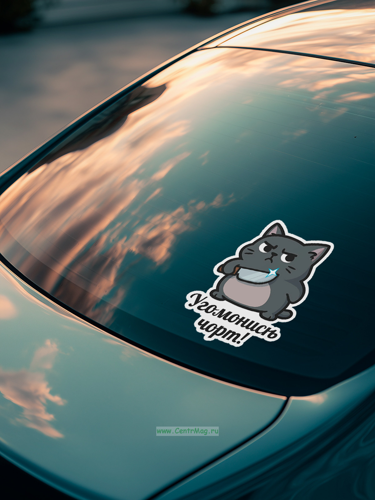 Прикольная наклейка "Угомонись чорт" (коварный кот), А5