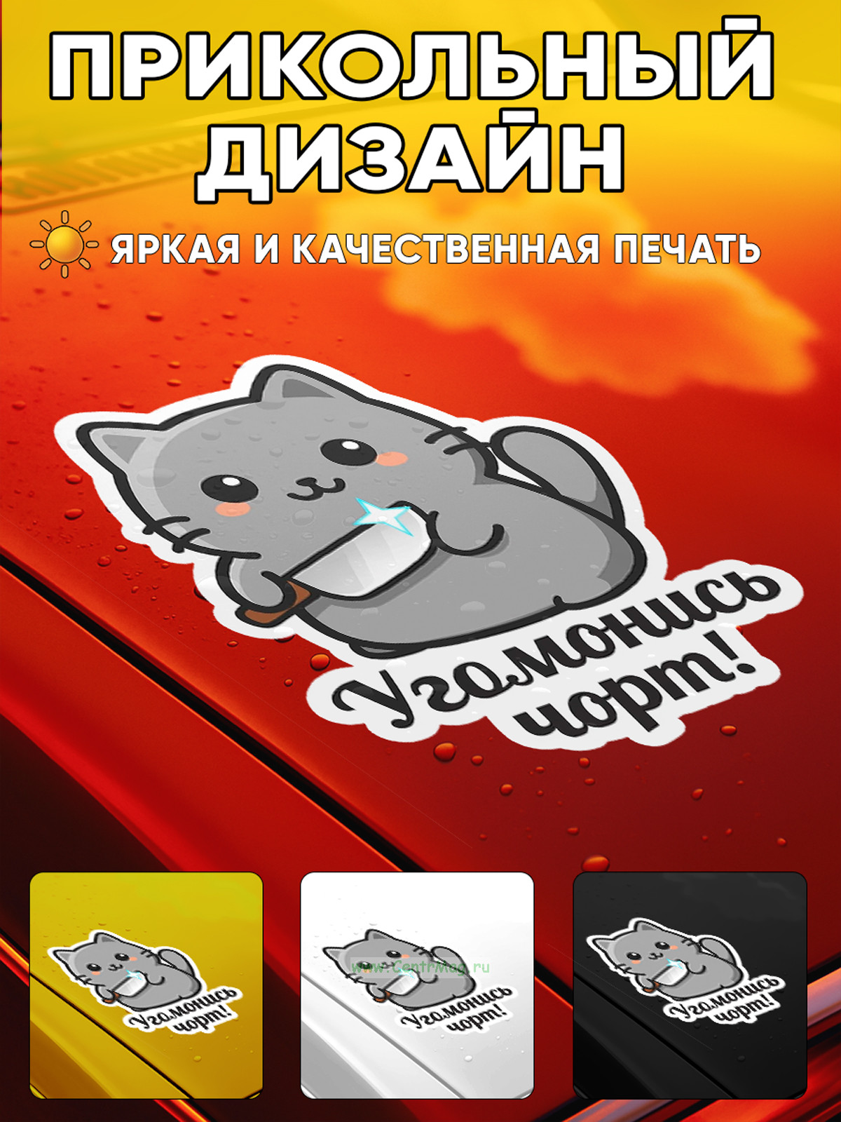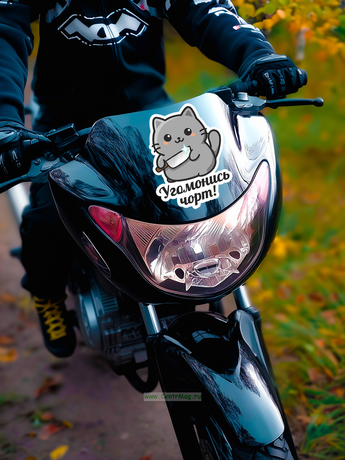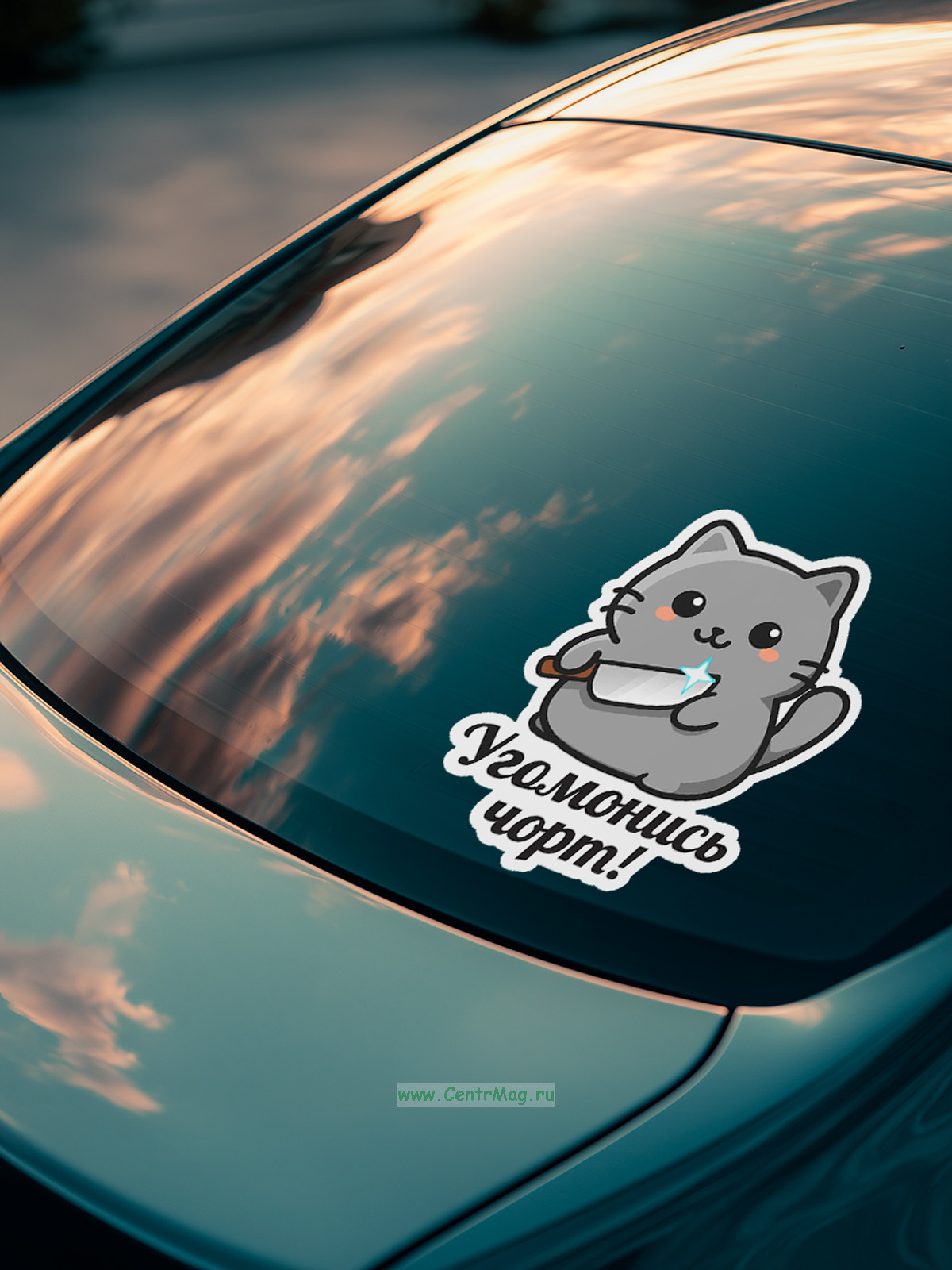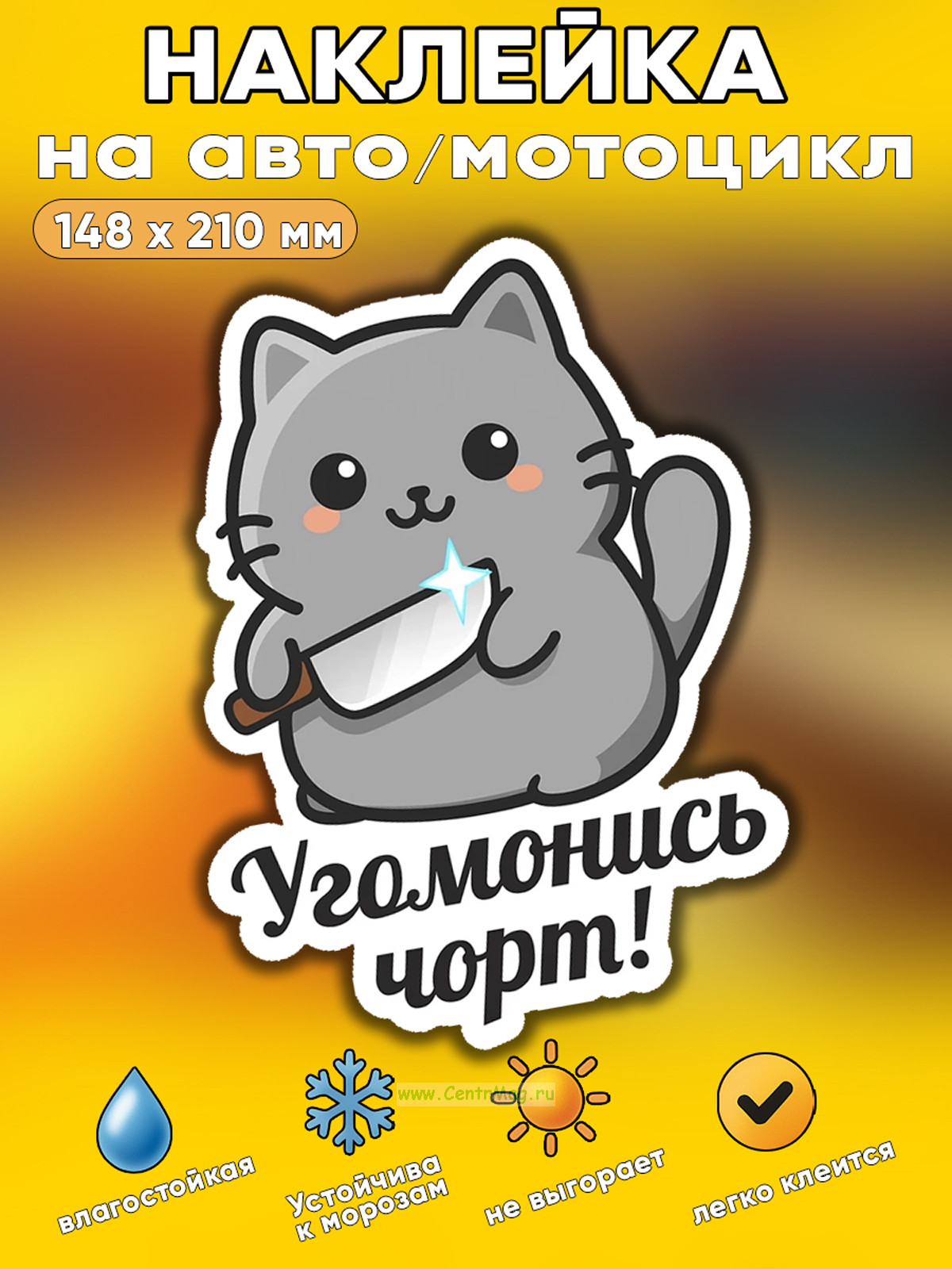 Прикольная наклейка "Угомонись чорт" (коварный кот), А5