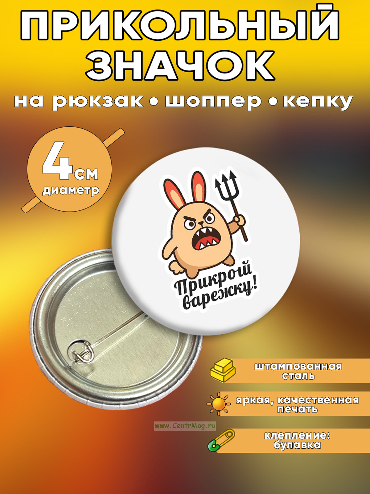 Значок - это стильный и качественный аксессуар, который идеально подходит для украшения одежды, сумок, рюкзаков или других предметов. Яркий и оригинальный дизайн значка подчеркнет вашу индивидуальность и добавит уникальности вашему стилю. Изготовлен из штампованной стали с прочной эмалью, значок устойчив к внешним воздействиям, включая дождь и солнечные лучи. Он легко крепится к одежде или аксессуарам с помощью надежной булавки, не оставляя следов при удалении. Значок сохраняет свою яркость и четкость изображения на протяжении долгого времени.