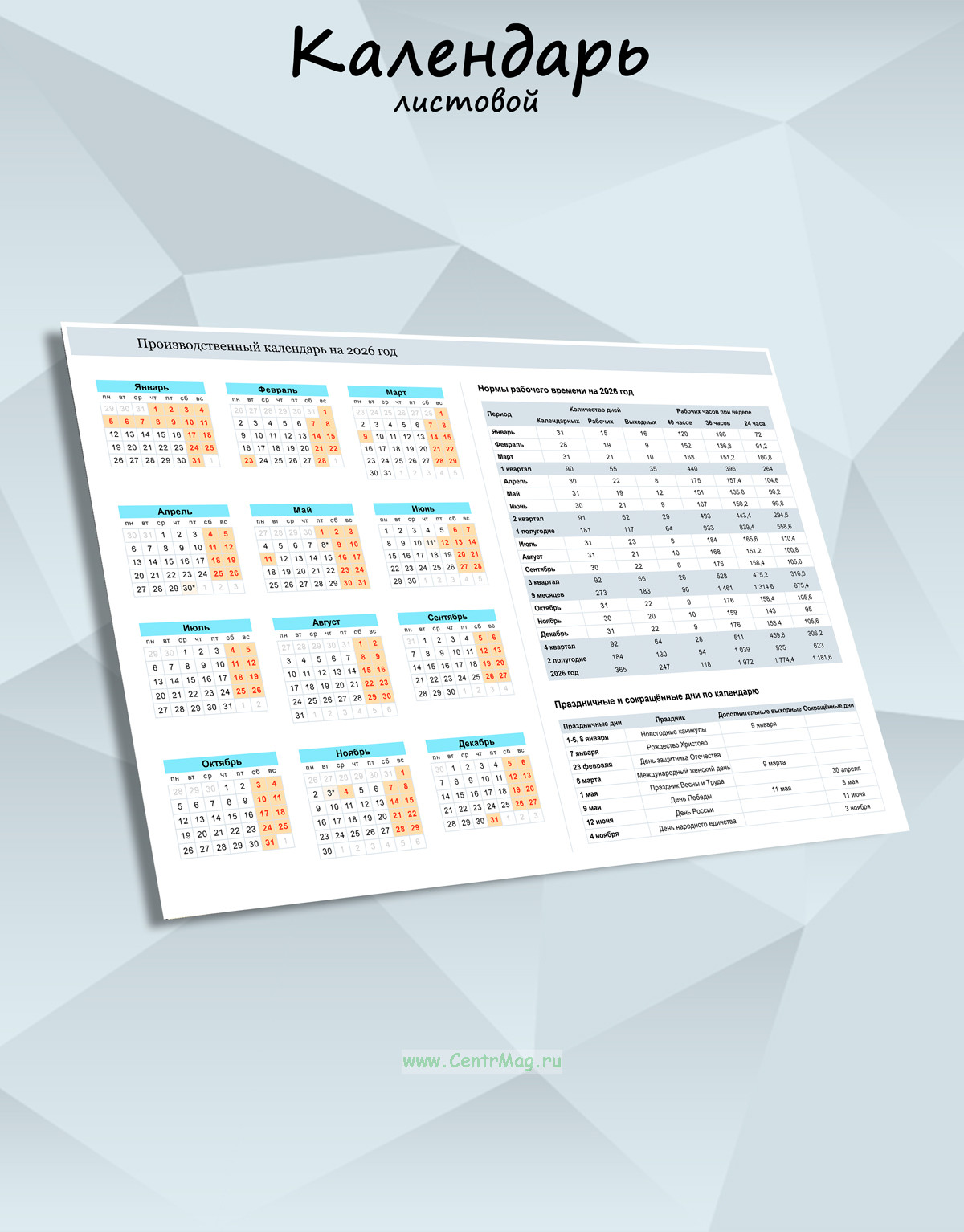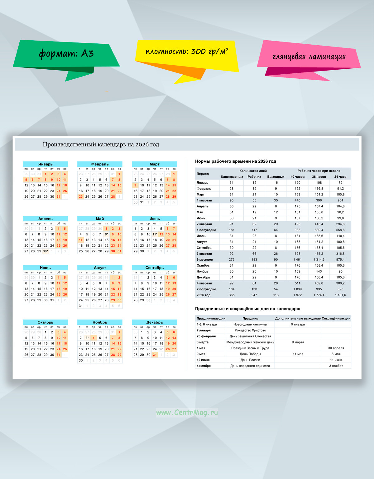 На плакате изображено расписание рабочих, выходных и праздничных дней, таблица норм рабочего времени, праздничных и сокращенных дней в 2026 году.