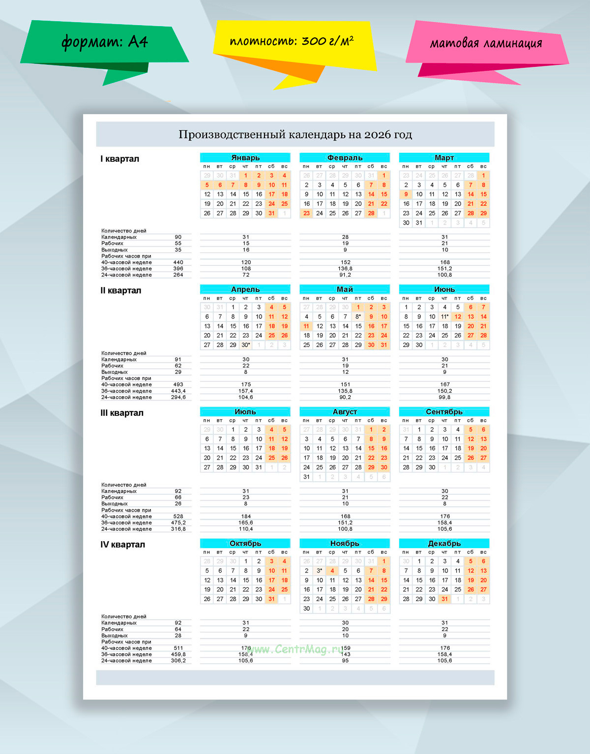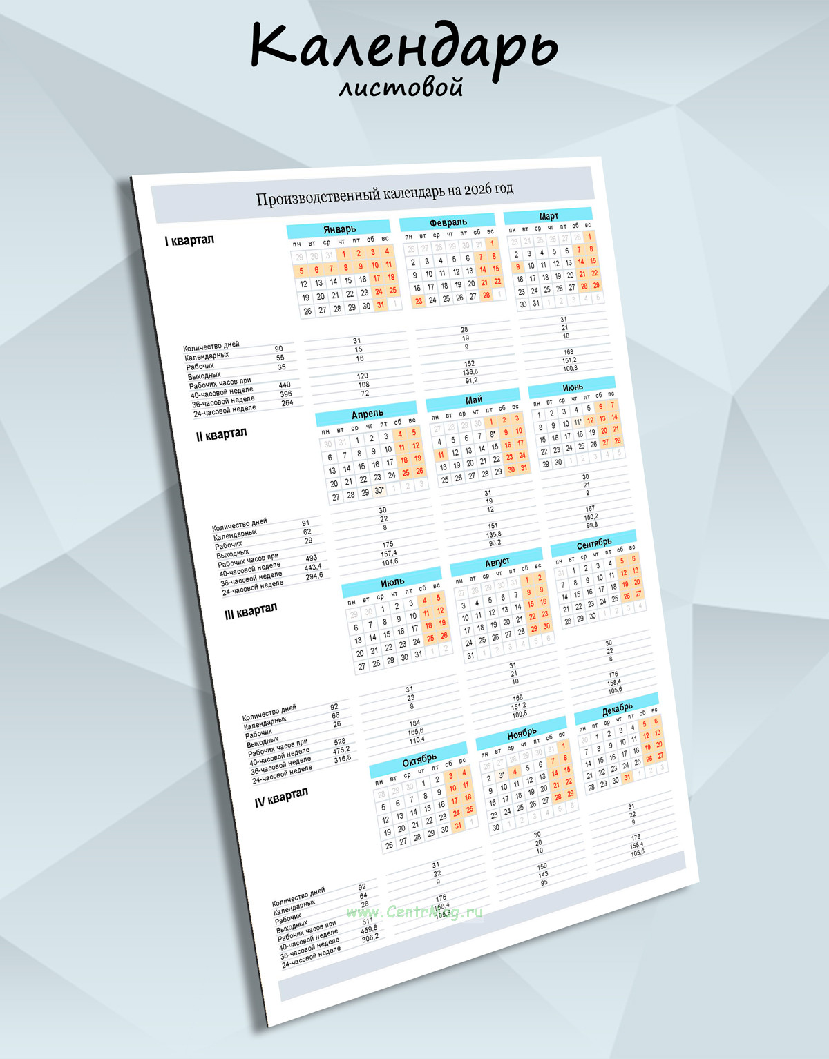 В календаре изображено расписание рабочих, выходных и праздничных дней, таблица общего количества календарных, рабочих и выходных дней в 2026 году, а также рабочих часов при 40, 36 и 24 часовой неделе по кварталам 2026 года.