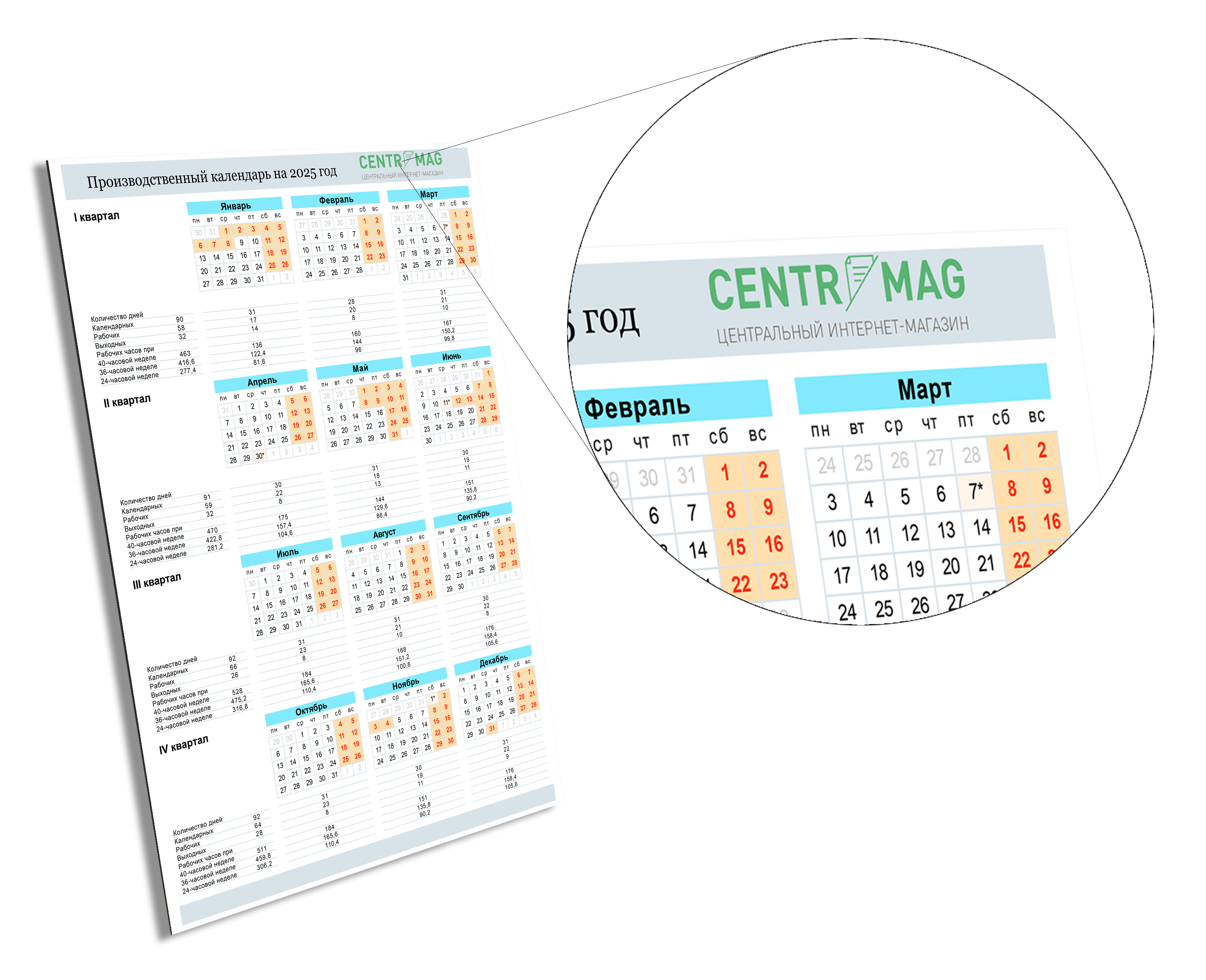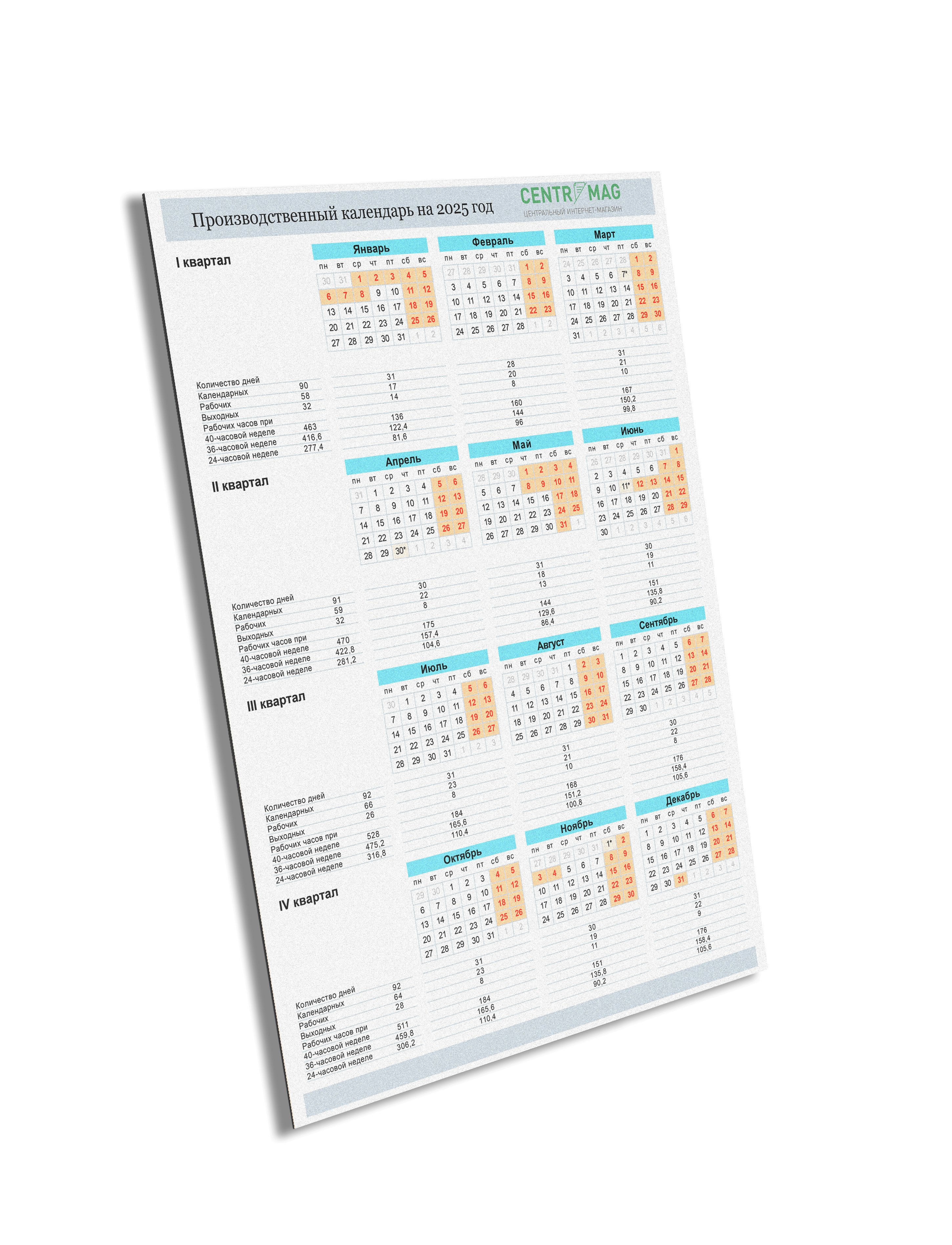 На плакате изображено расписание рабочих, выходных и праздничных дней, таблица общего количества дней и норм рабочего времени в 2026 году.