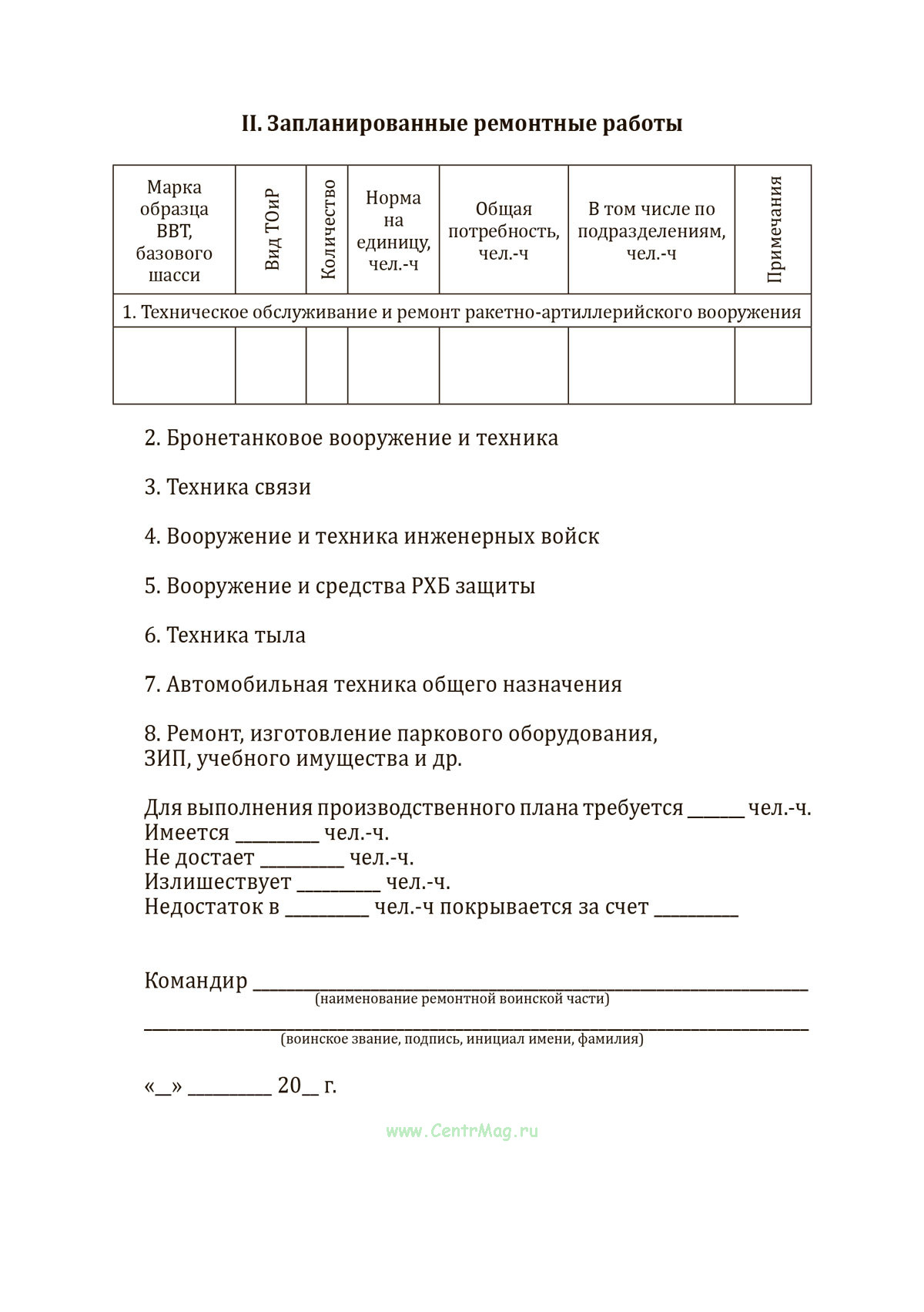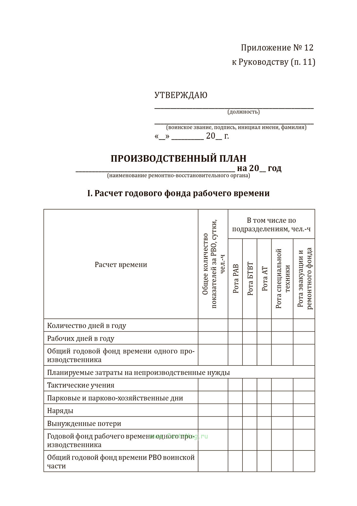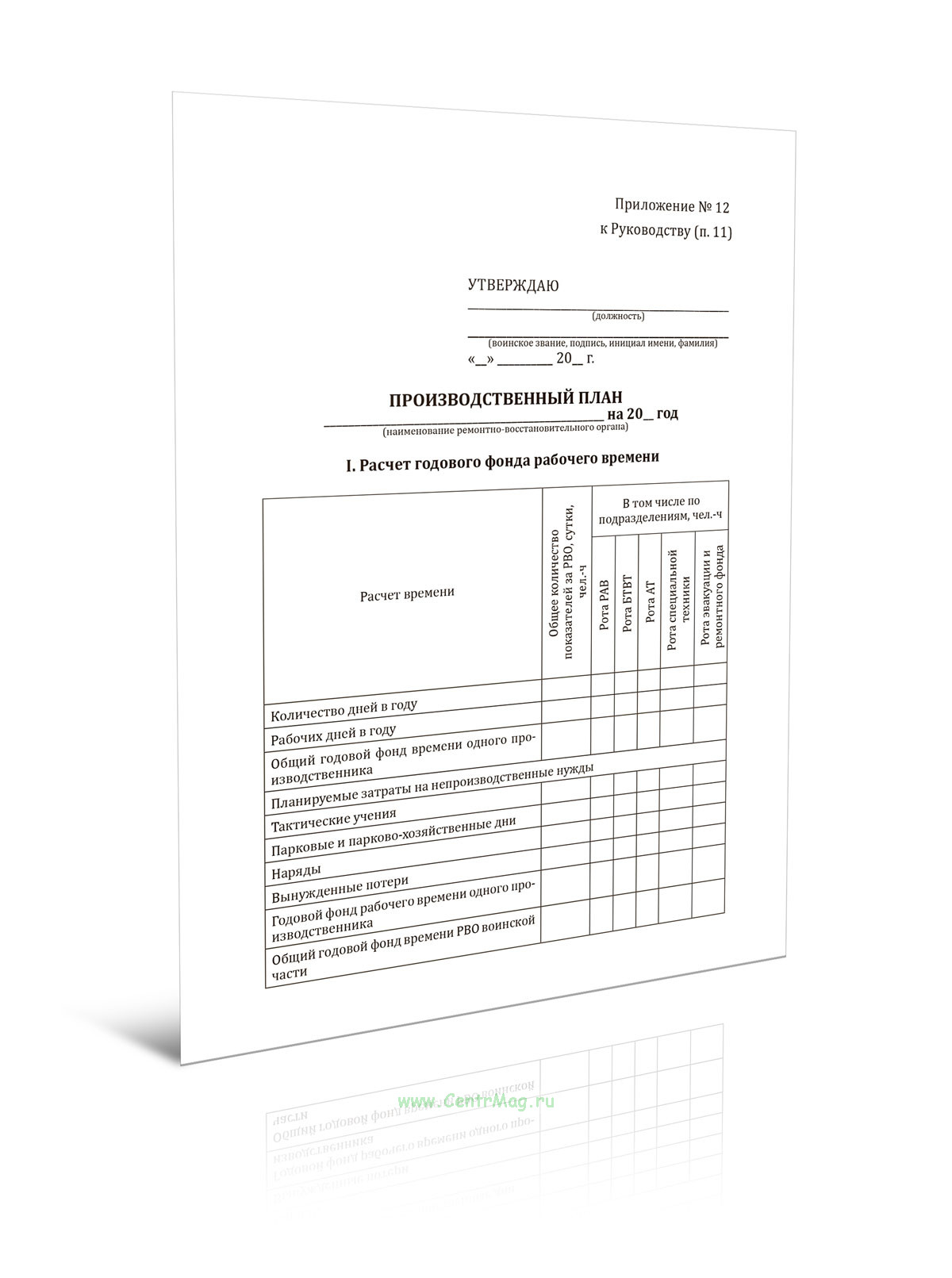 Форма Производственного плана соответствует Приложению № 12 Приказу Министра обороны РФ от 28.12.2013 N 969 "Об утверждении Руководства по содержанию вооружения и военной техники общевойскового назначения, военно-технического имущества в Вооруженных Силах Российской Федерации"