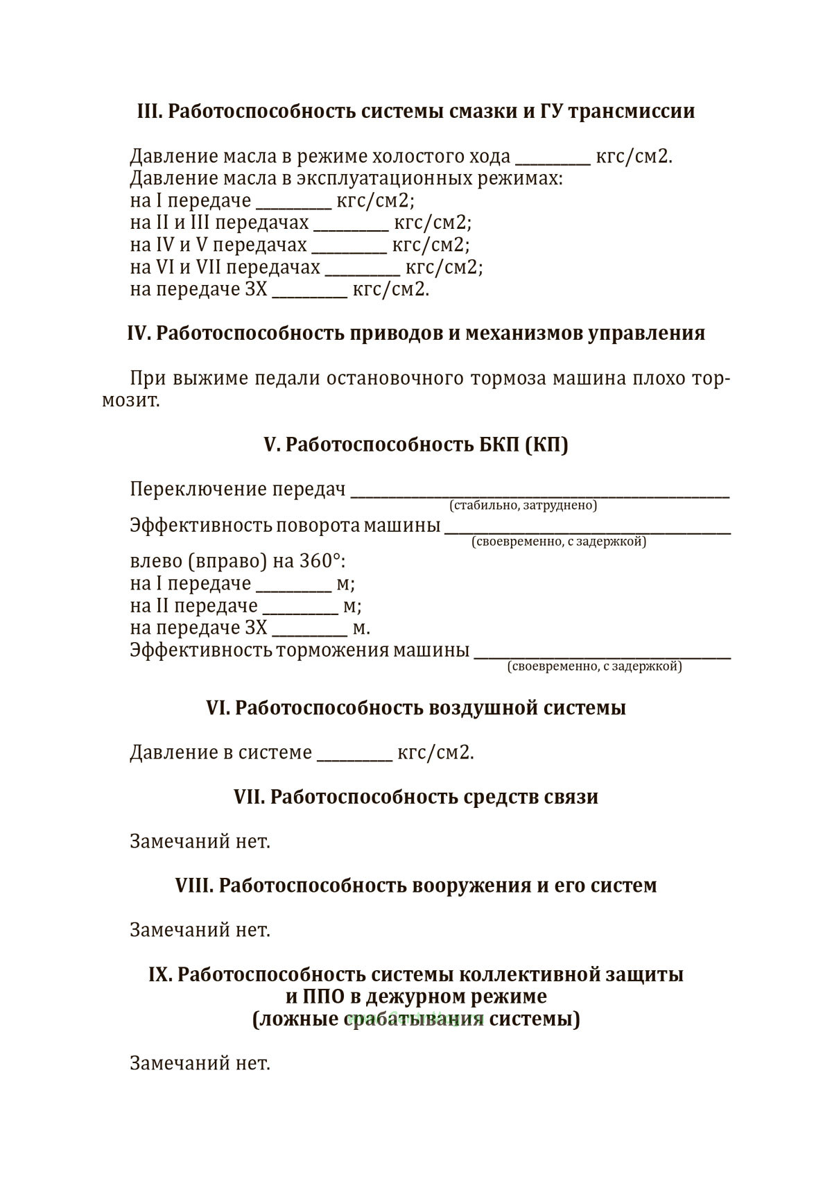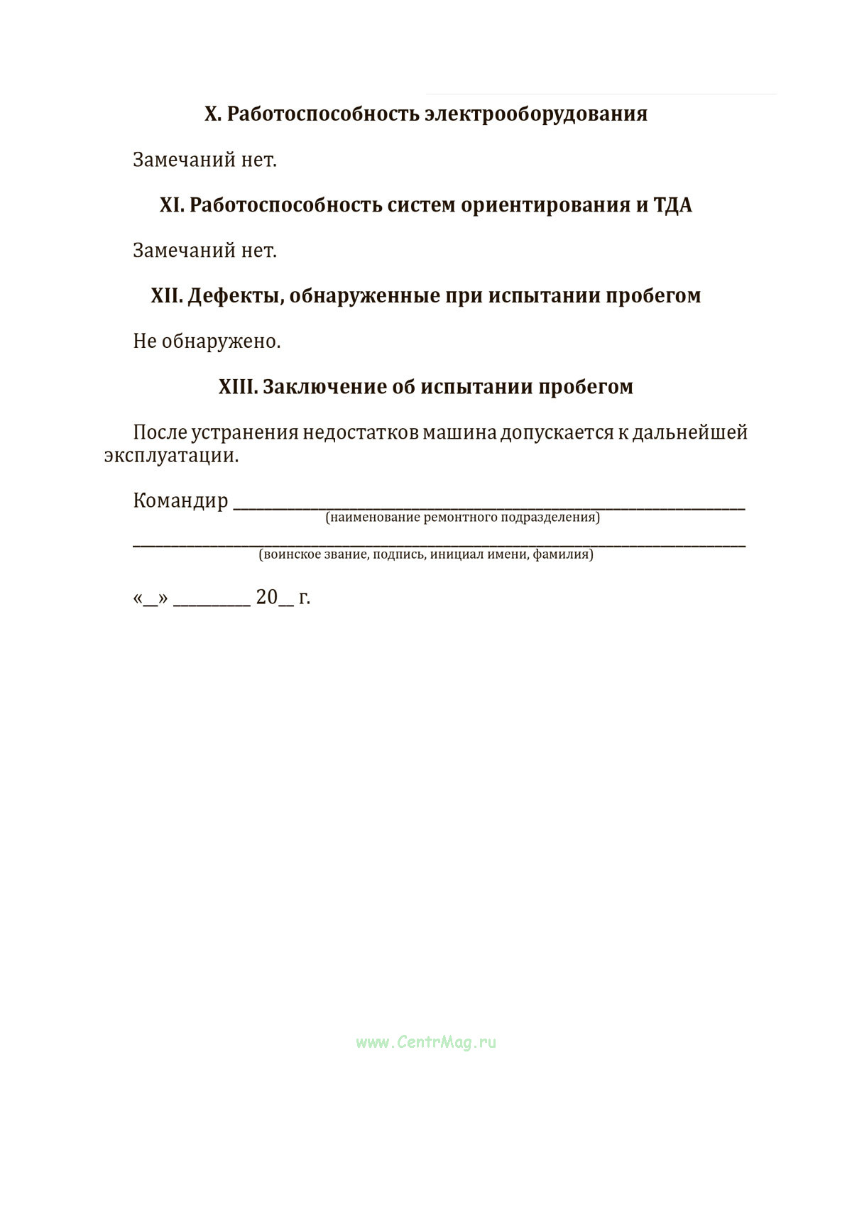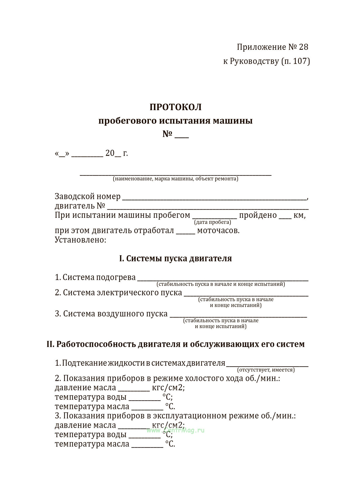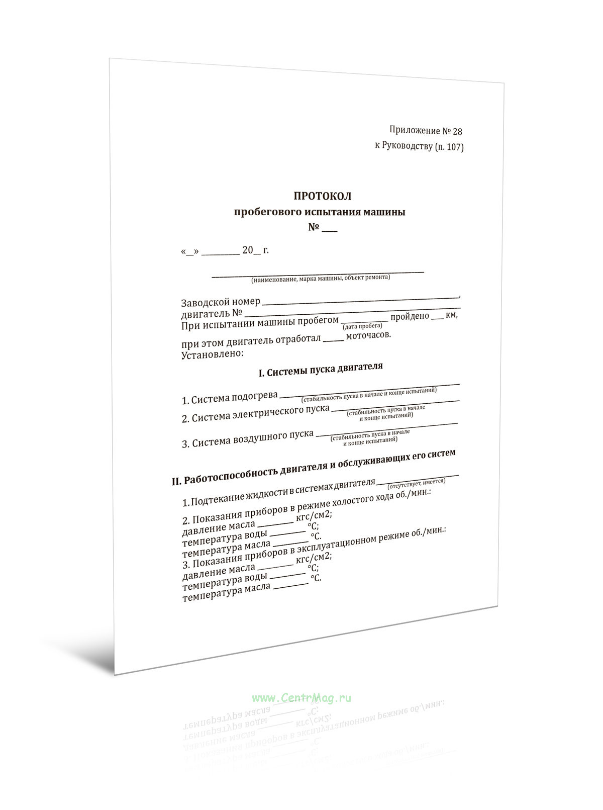 Форма Протокола пробегового испытания машины соответствует Приложению № 28 Приказу Министра обороны РФ от 28.12.2013 N 969 "Об утверждении Руководства по содержанию вооружения и военной техники общевойскового назначения, военно-технического имущества в Вооруженных Силах Российской Федерации"