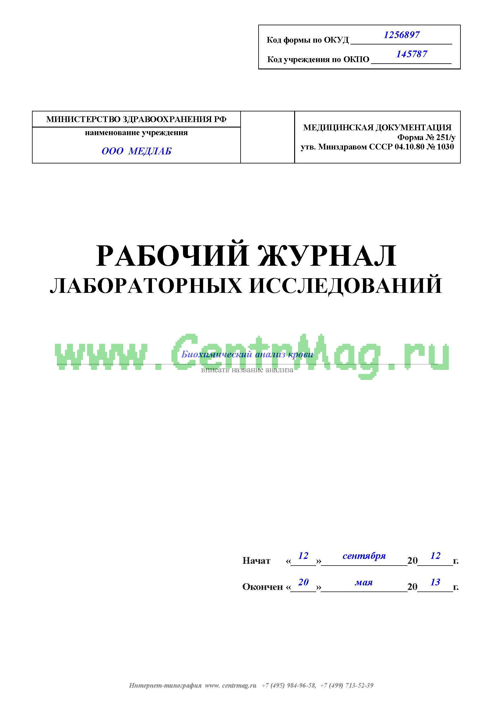 Рабочий журнал лабораторных исследований, форма 251/у, утвержден Приказом Минздрава СССР №1030 «Об утверждении форм первичной медицинской документации учреждений здравоохранения» от 4 октября 1980 г., который утратил силу.