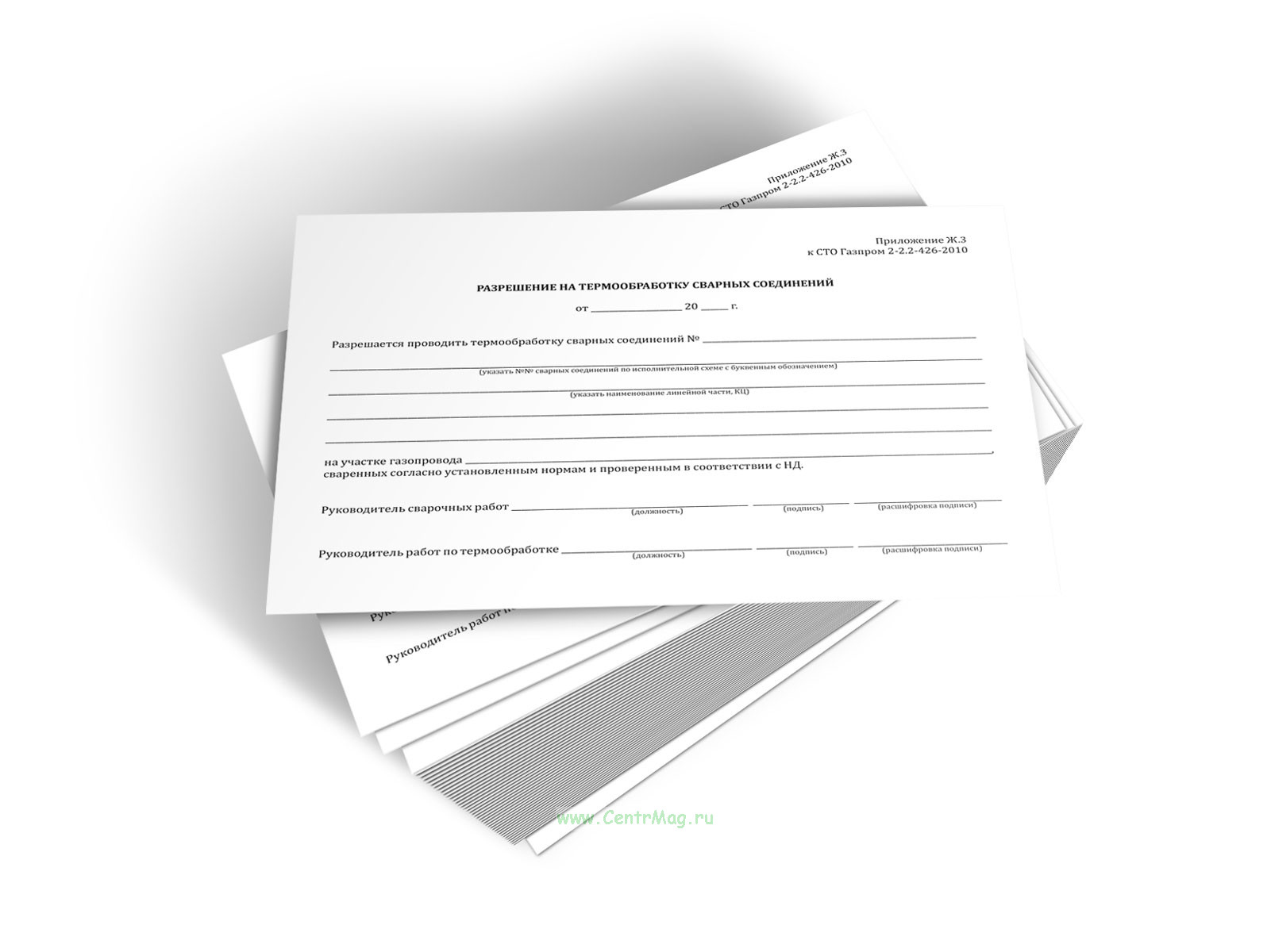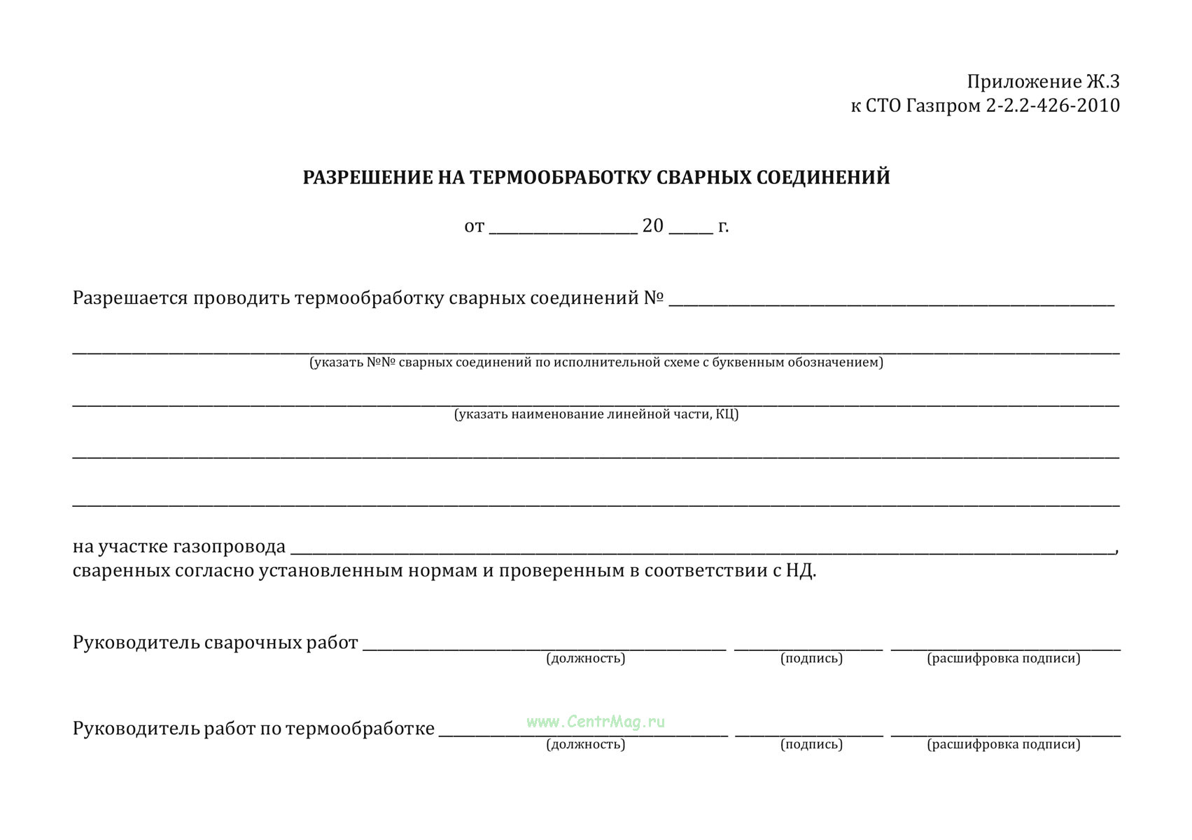 Форма Разрешения на термообработку сварных соединений соответствует Приложению Ж.2 к СТО Газпром 2-2.2-426-2010 "Инструкция по газопламенной обработке металлов при строительстве и ремонте промысловых и магистральных газопроводов, газопроводов систем газораспределения на объектах ОАО "Газпром"" утв. и введен распоряжением ОАО "Газпром" от 21 сентября 2009 г. № 296
