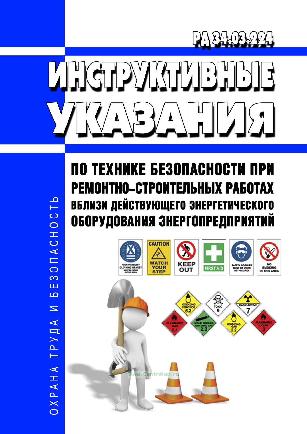 РД 34.03.224 "Инструктивные указания по технике безопасности при ремонтно-строительных работах вблизи действующего энергетического оборудования энергопредприятий" утв. начальник отдела по технике безопасности и промышленной санитарии Министерства энергетики и электрификации СССР Р. Гаджиев 18 декабря 1970 г.