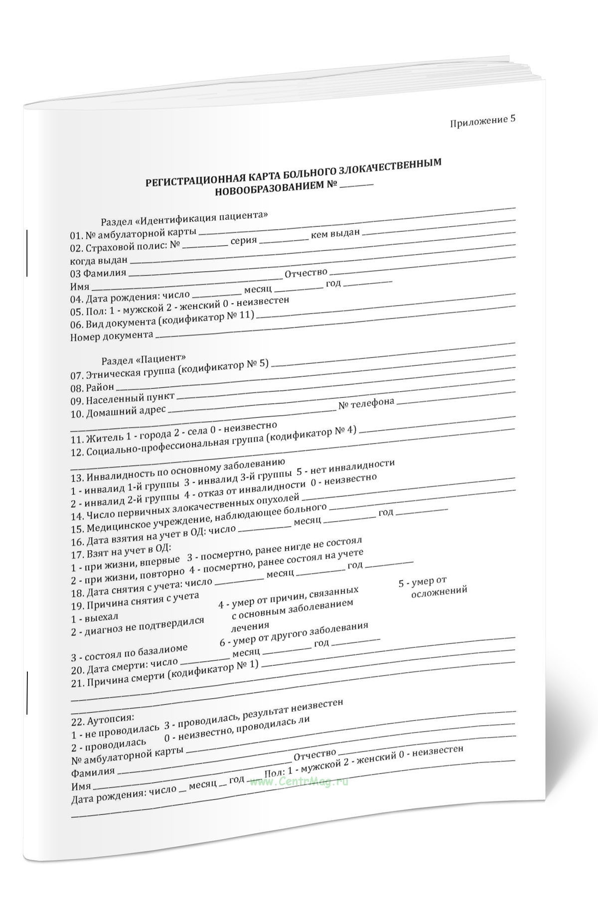 Форма регистрационной карты соответствует Приложению 5 к Письму Минздрава России от 17.08.2021 N 17-4/3549 О направлении "Методических рекомендаций по организации центров амбулаторной онкологической помощи в субъектах Российской Федерации"