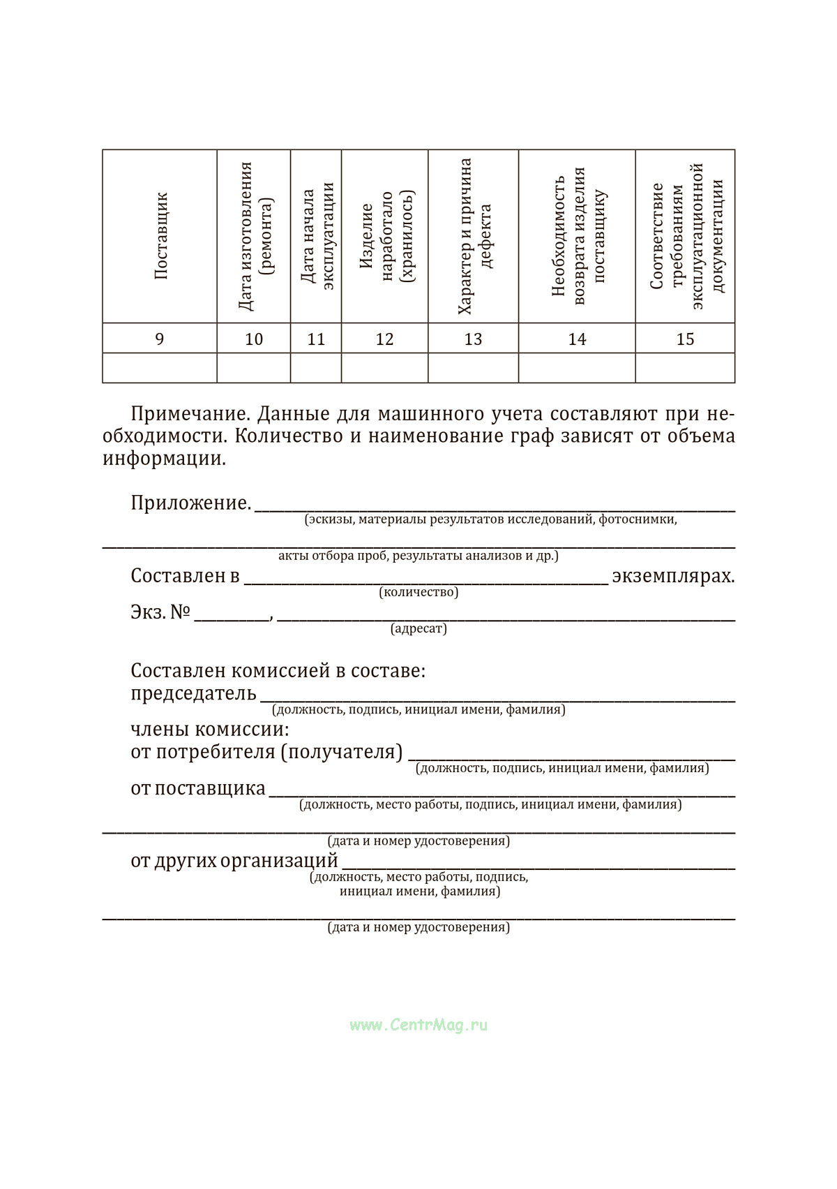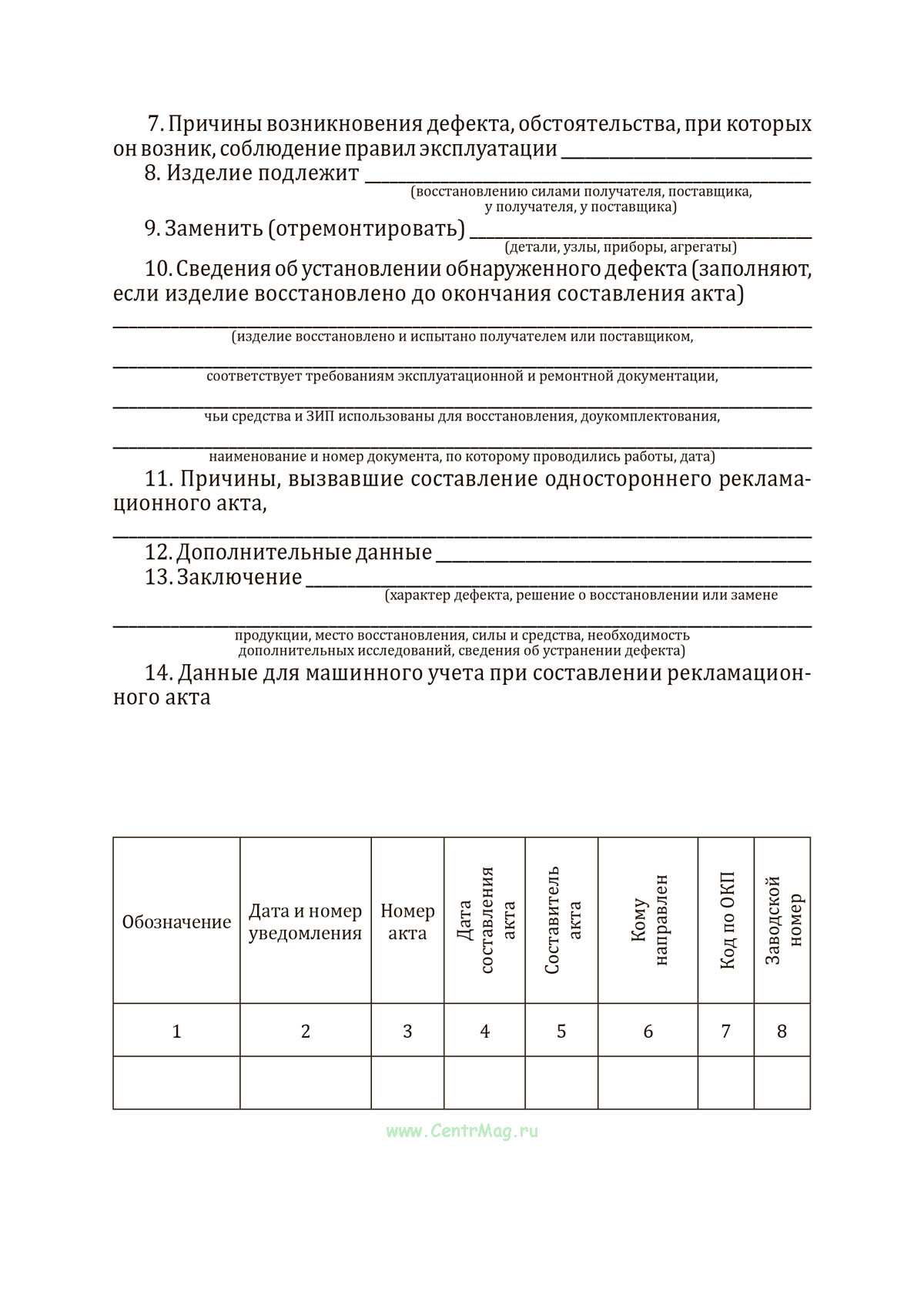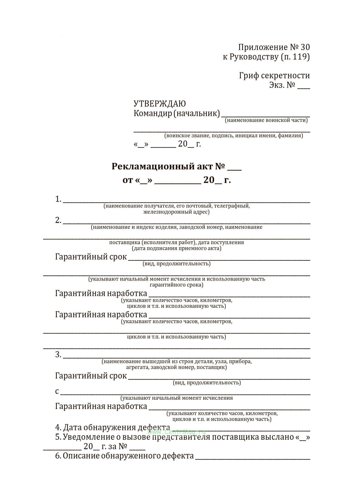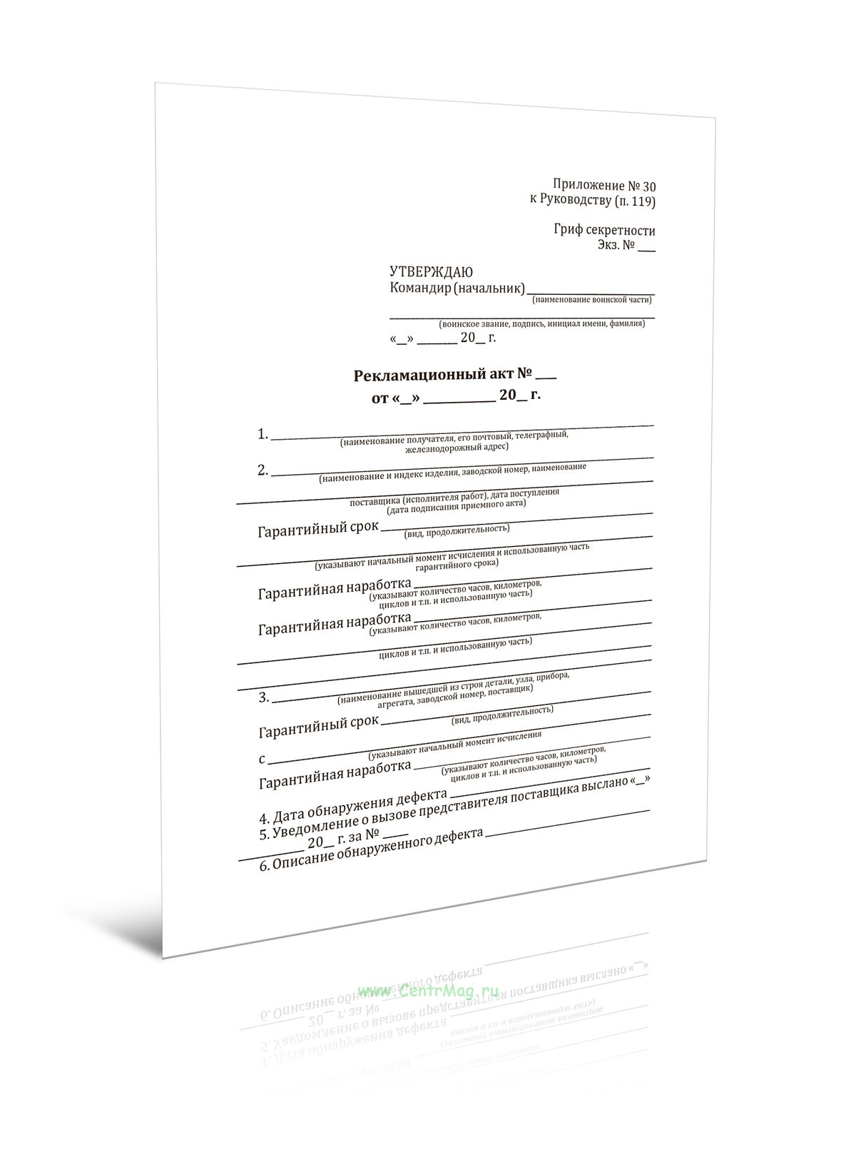 Форма Рекламационног акта соответствует Приложению № 30 Приказу Министра обороны РФ от 28.12.2013 N 969 "Об утверждении Руководства по содержанию вооружения и военной техники общевойскового назначения, военно-технического имущества в Вооруженных Силах Российской Федерации"