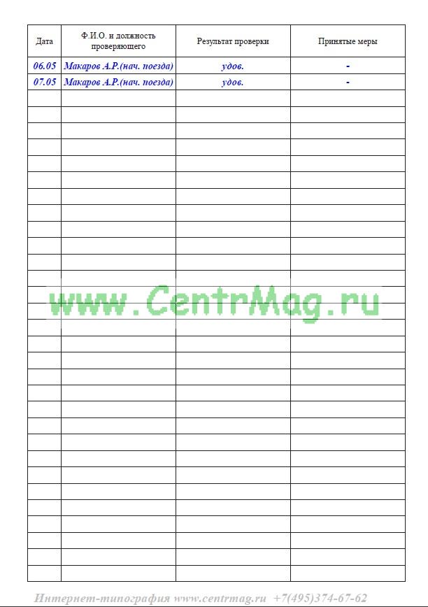 В рейсовый журнал записываются результаты проверки контролирующими органами соответствие веса багажа оплаченному, правильность взимания с пассажиров денежных средств по установленному тарифу.