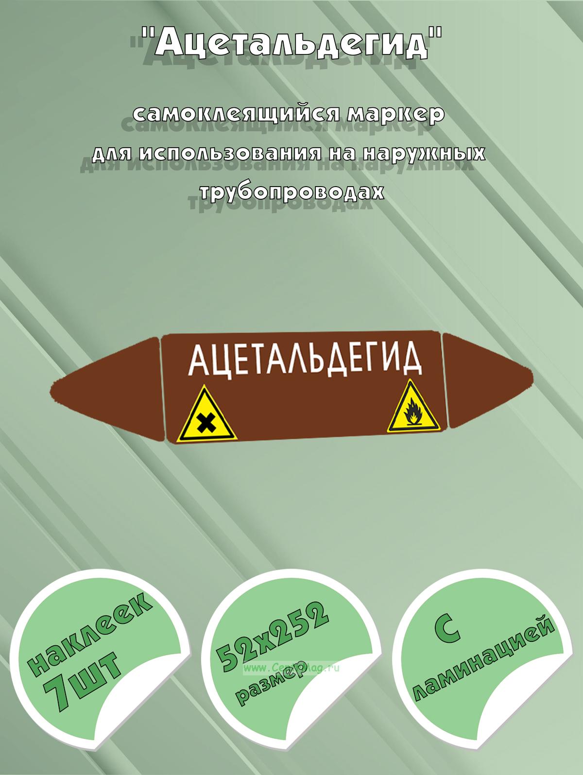 Самоклеящийся маркер "Ацетальдегид, легковоспламеняющиеся, вредные вещества" (74 х 358 мм, с ламинацией) для использования на наружных трубопроводах (210 руб.)