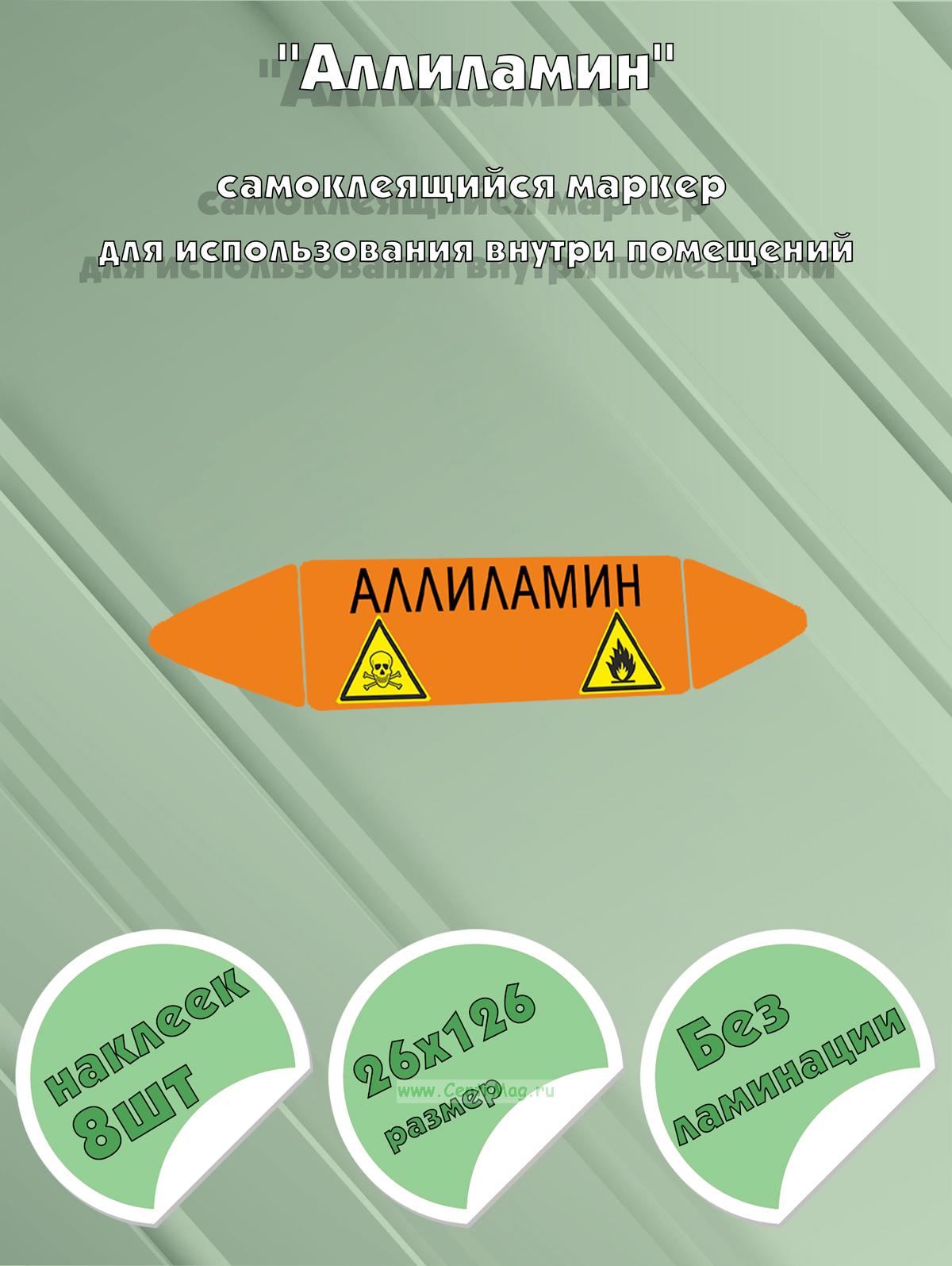 Самоклеющийся маркер «Аллиламин, легковоспламеняющиеся и ядовитые вещества» (26 х 126 мм, с ламинацией) для использования на наружных трубопроводах (40 руб.)