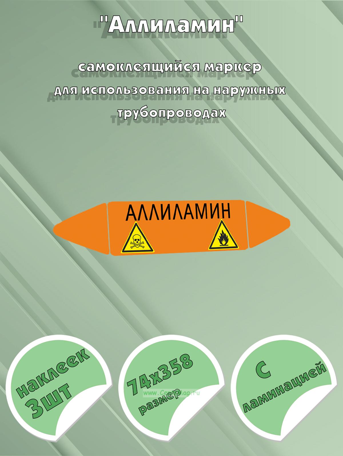 Самоклеющийся маркер «Аллиламин, легковоспламеняющиеся и ядовитые вещества» (74 х 358 мм, с ламинацией) для использования на наружных трубопроводах