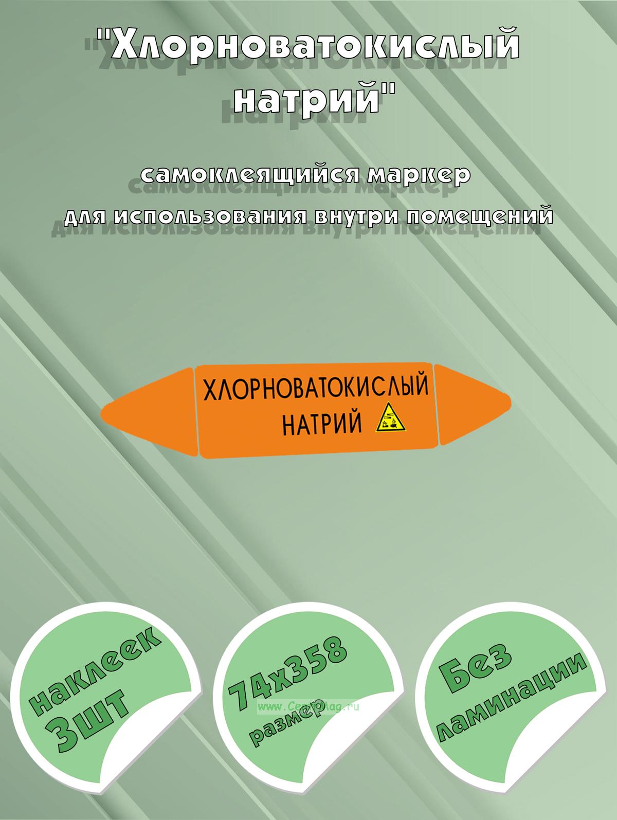 Самоклеющийся маркер «Хлорноватокислый натрий, коррозионные вещества» (74 х 358 мм, с ламинацией) для использования на наружных трубопроводах (210 руб.)