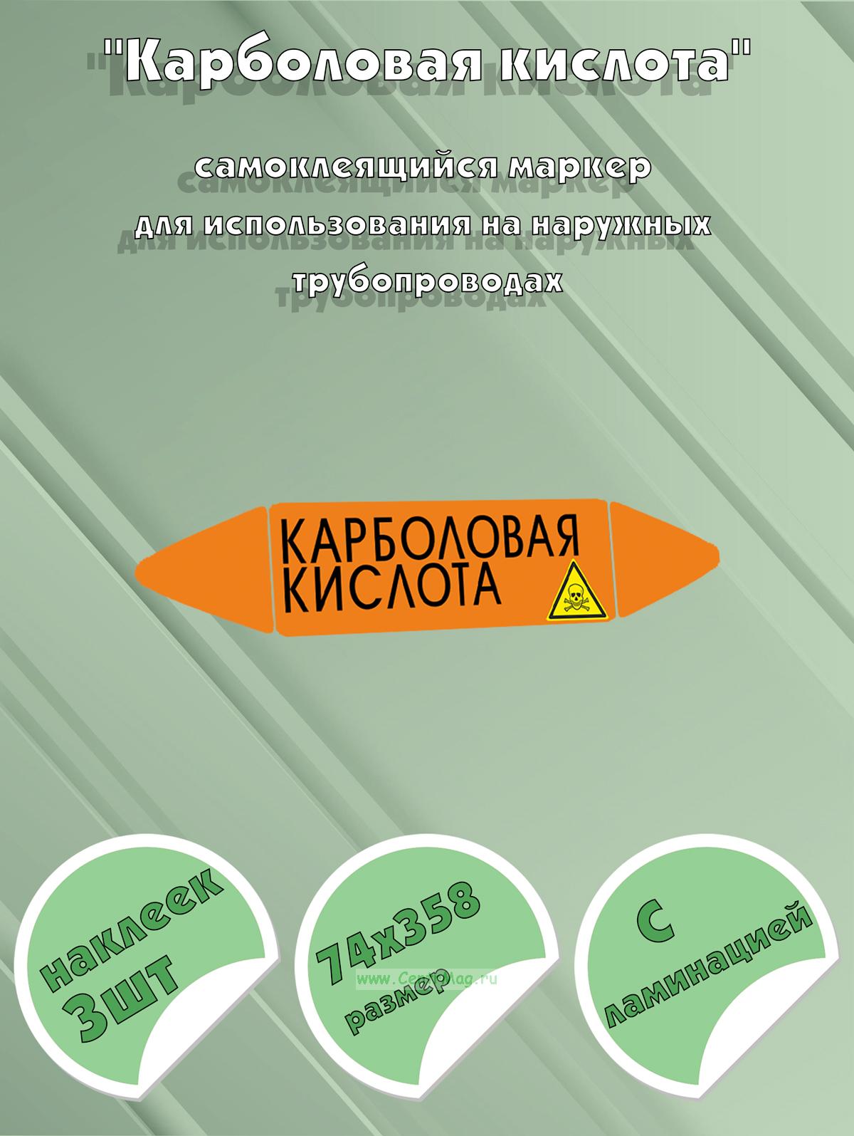 Самоклеющийся маркер «Карболовая кислота, ядовитые вещества» (74 х 358 мм, с ламинацией) для использования на наружных трубопроводах