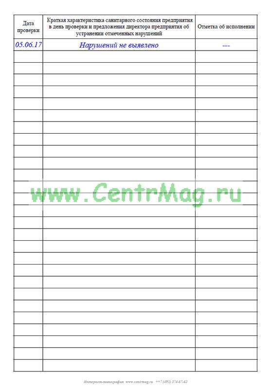В нём осуществляются записи о санитарном состоянии объекта, и соблюдения сотрудниками санитарно-гигиенического режима. За санитарное состояние объекта отвечает руководитель предприятия или лицо его замещающее.