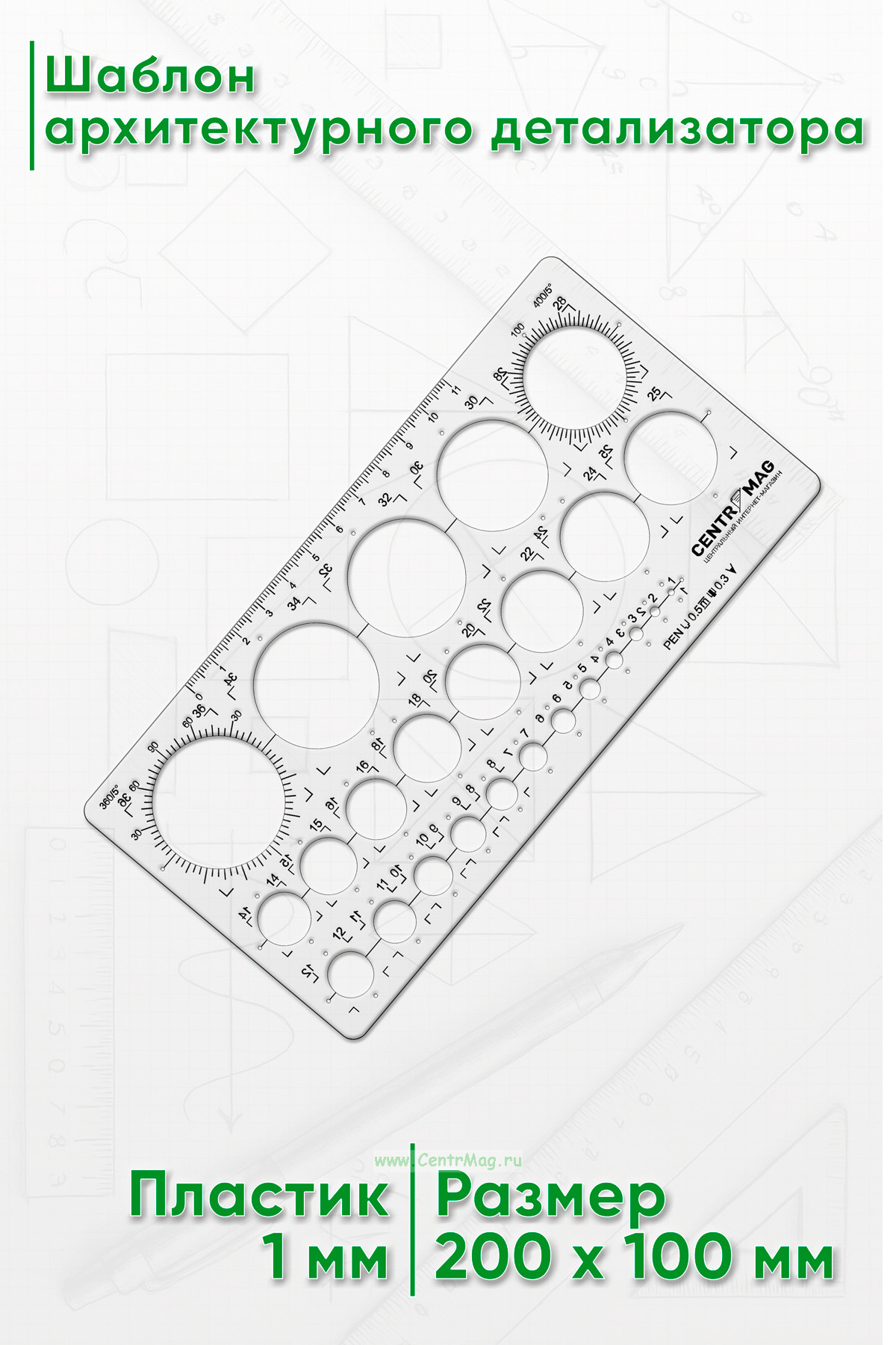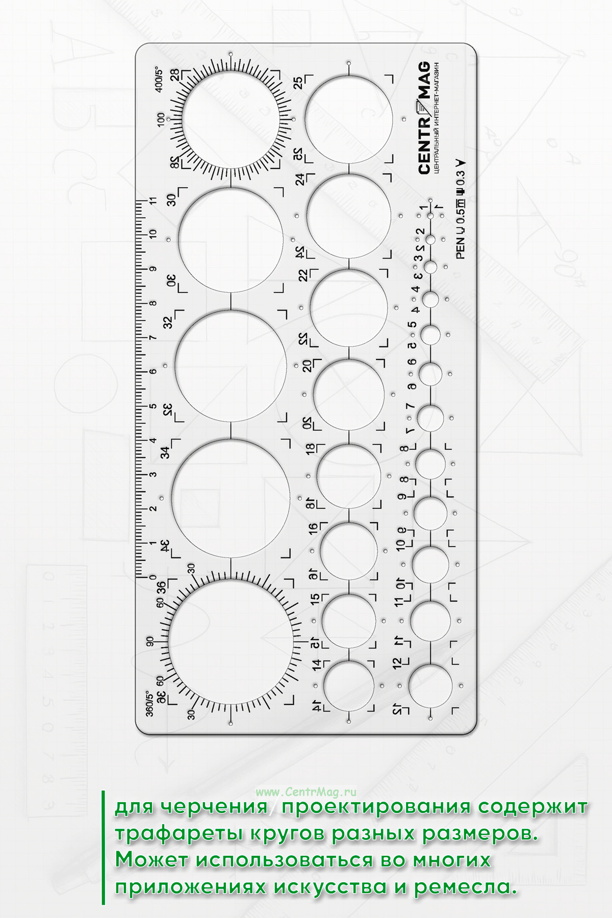 Шаблон для черчения/проектирования содержит трафареты кругов разных размеров. Может использоваться во многих приложениях искусства и ремесла.