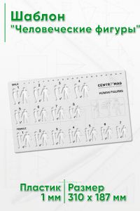 Шаблон для черчения/проектирования содержит трафареты силуэтов человеческий фигур. Изготовлен из прозрачного пластика