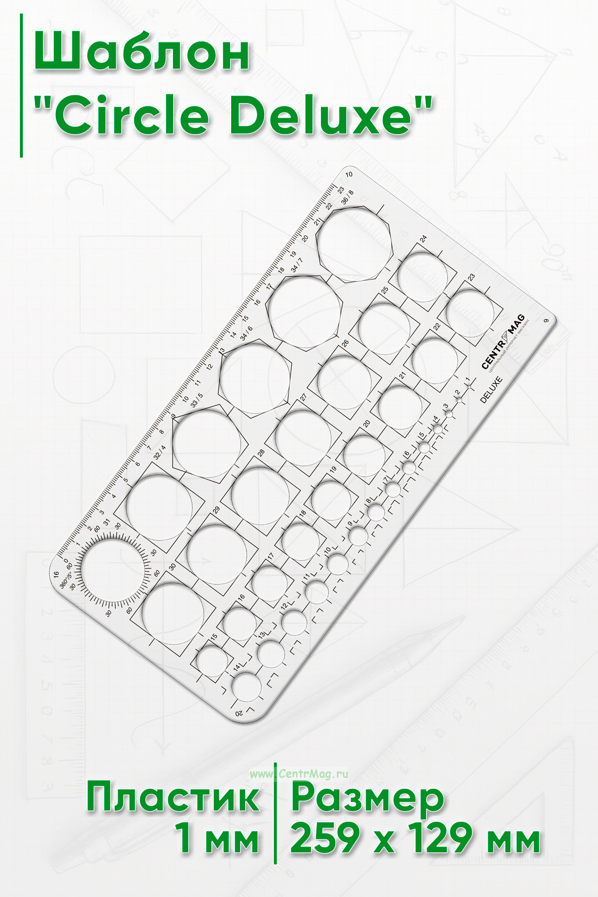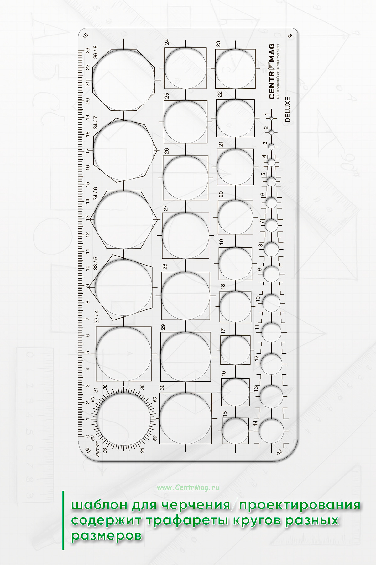 Шаблон для черчения/проектирования содержит трафареты кругов разных размеров. Может использоваться во многих приложениях искусства и ремесла.