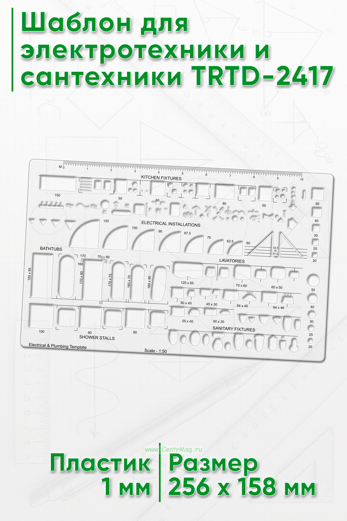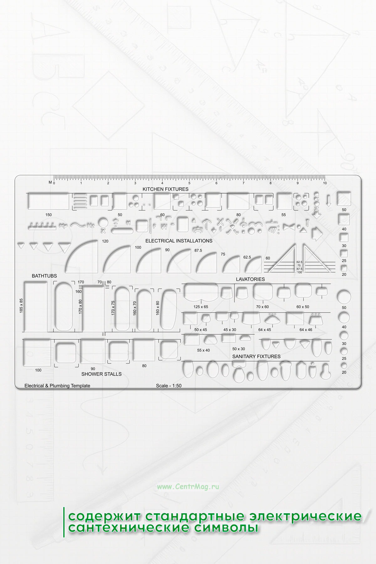 Шаблон содержит стандартные электрические/сантехнические символы.