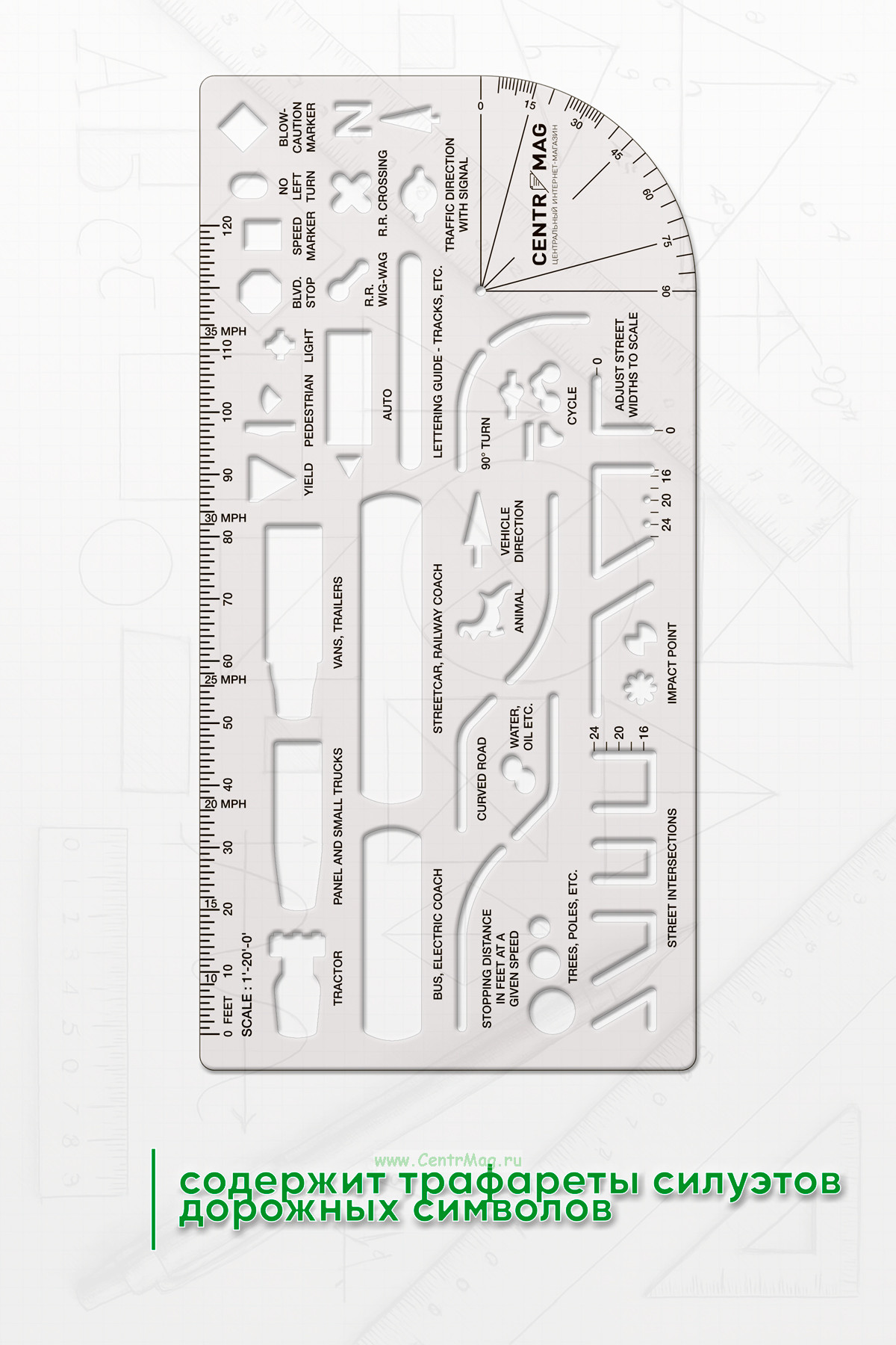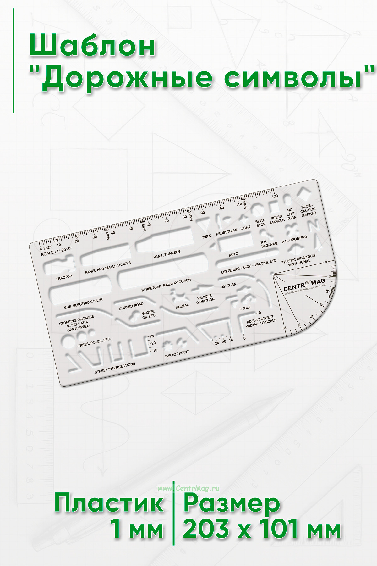 Шаблон для черчения/проектирования содержит трафареты силуэтов дорожных символов. Изготовлен из прозрачного пластика.