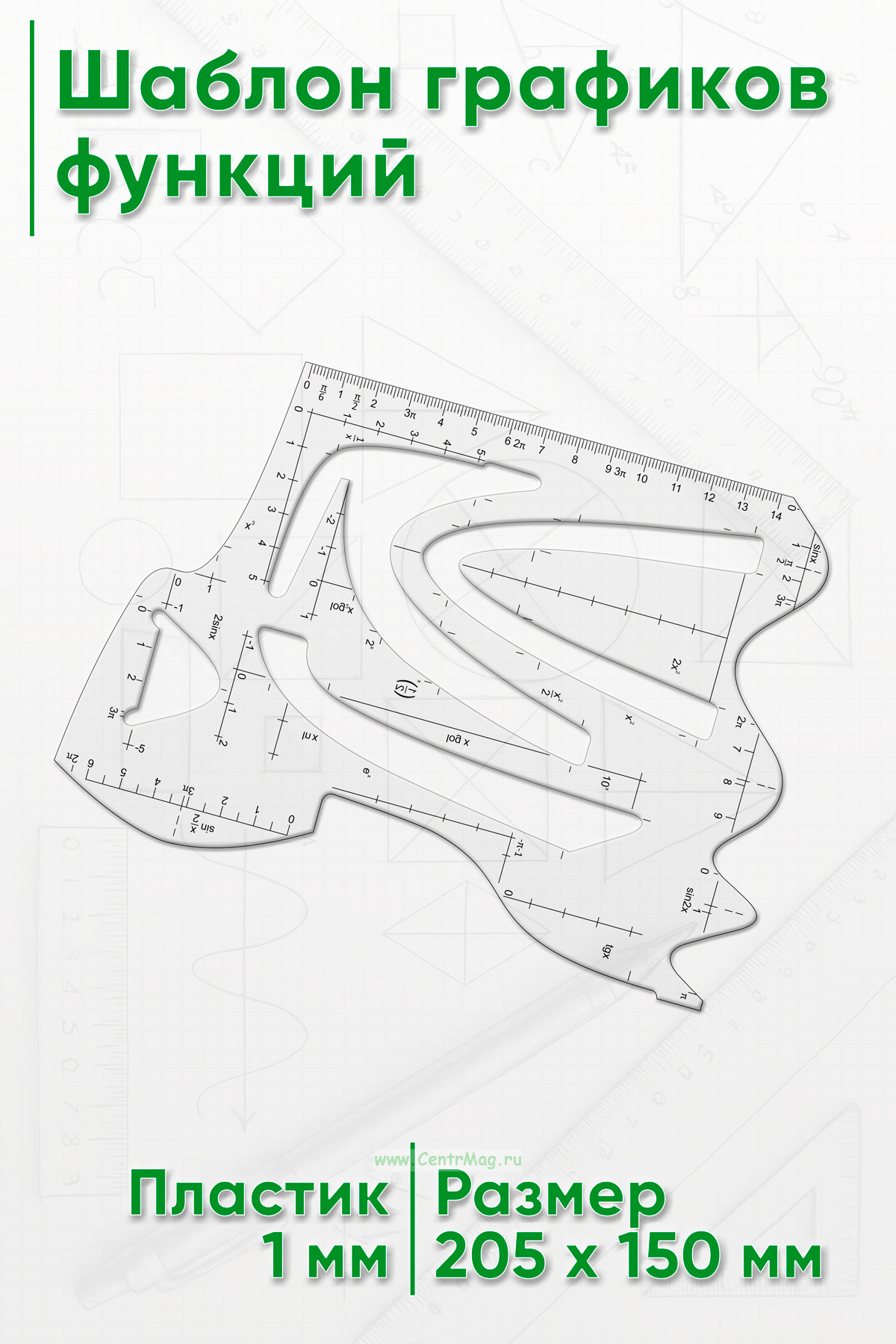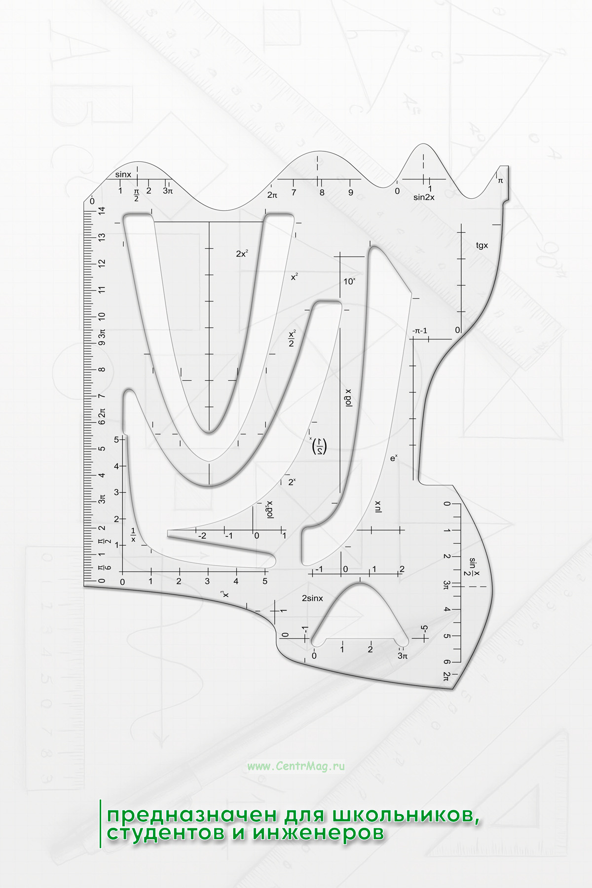 Шаблон содержит несколько вариантов графика функций, а также линейку длиной 14 см. Предназначен для школьников, студентов и инженеров.