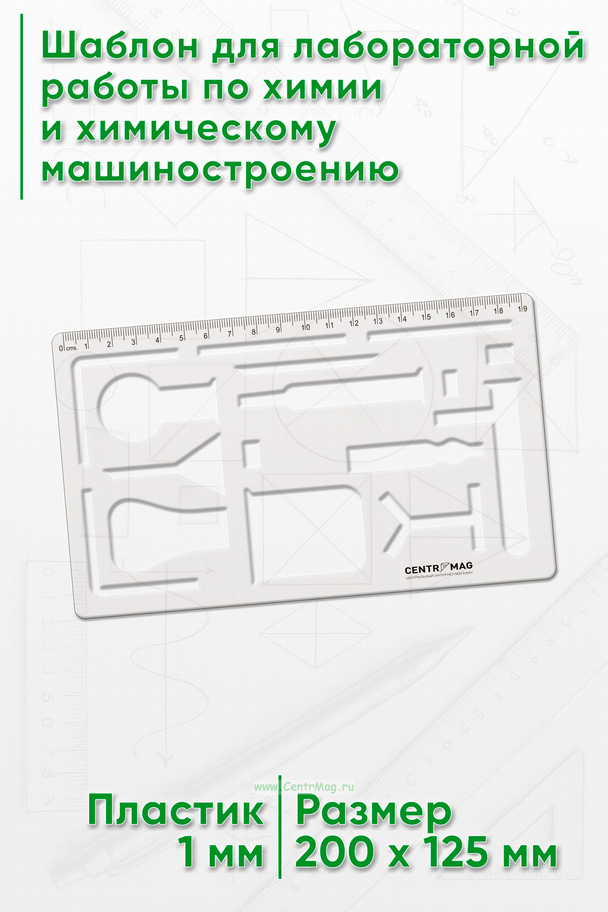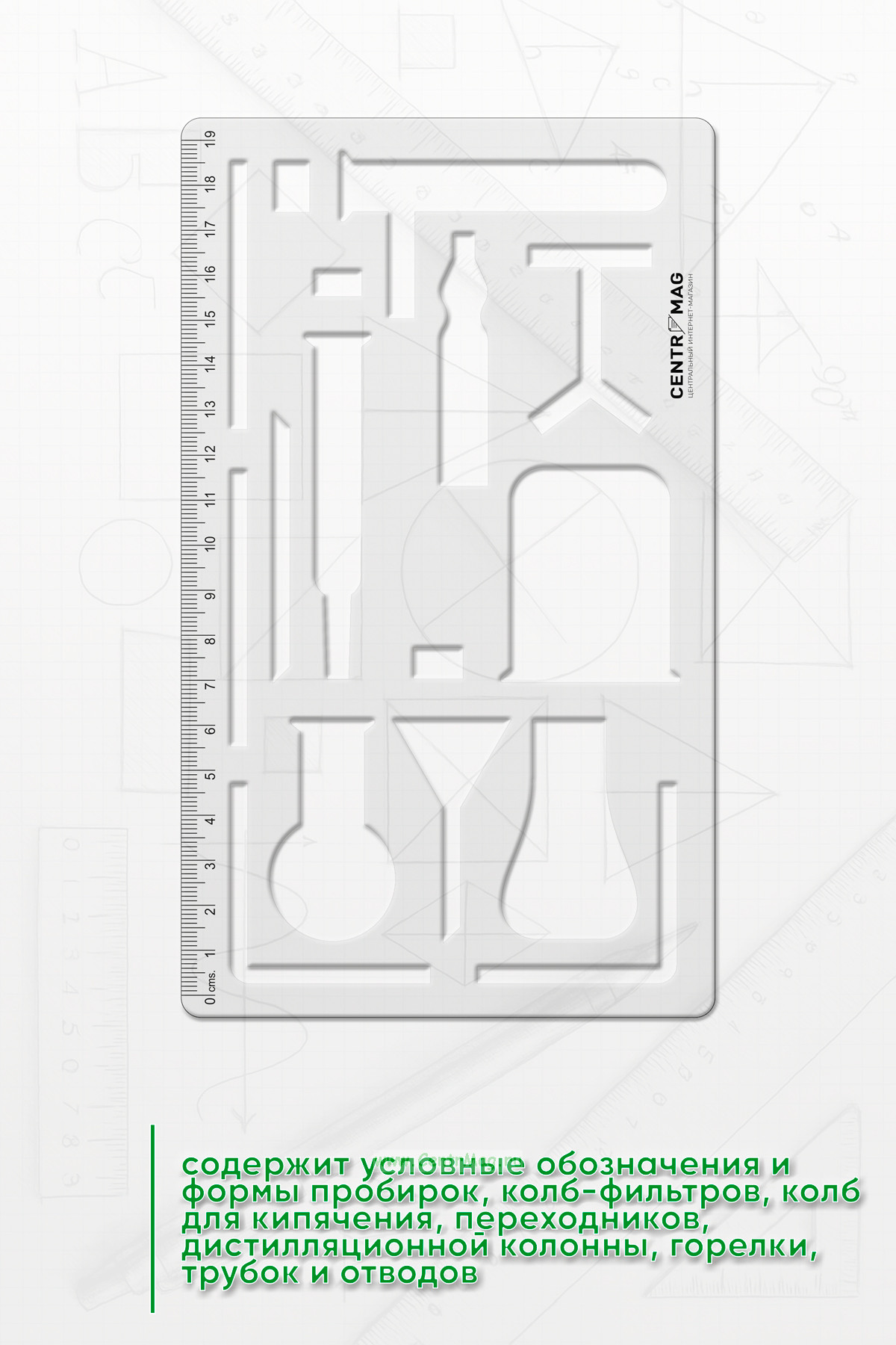 Шаблон содержит условные обозначения и формы пробирок, колб-фильтров, колб для кипячения, переходников, дистилляционной колонны, горелки, трубок и отводов. Изготовлен из прозрачного пластика.