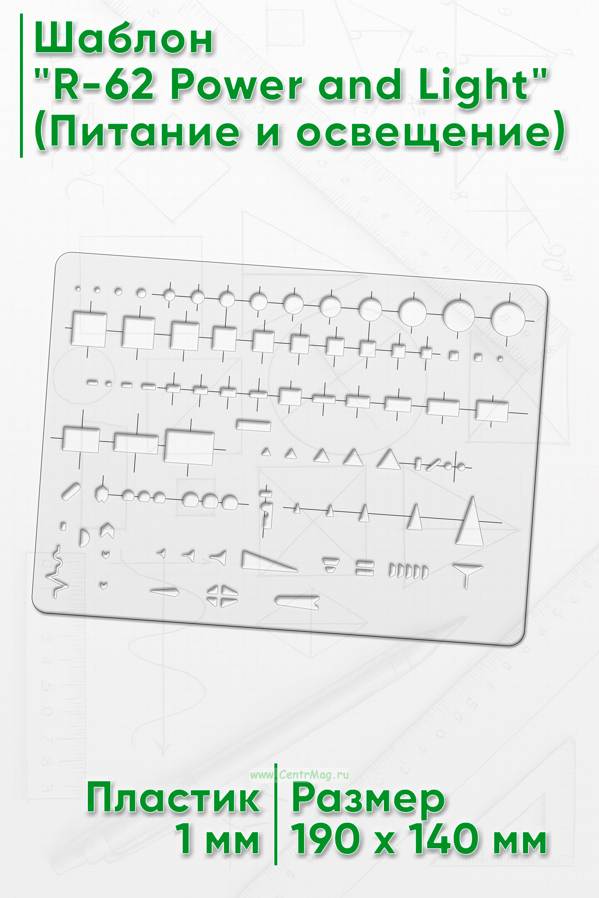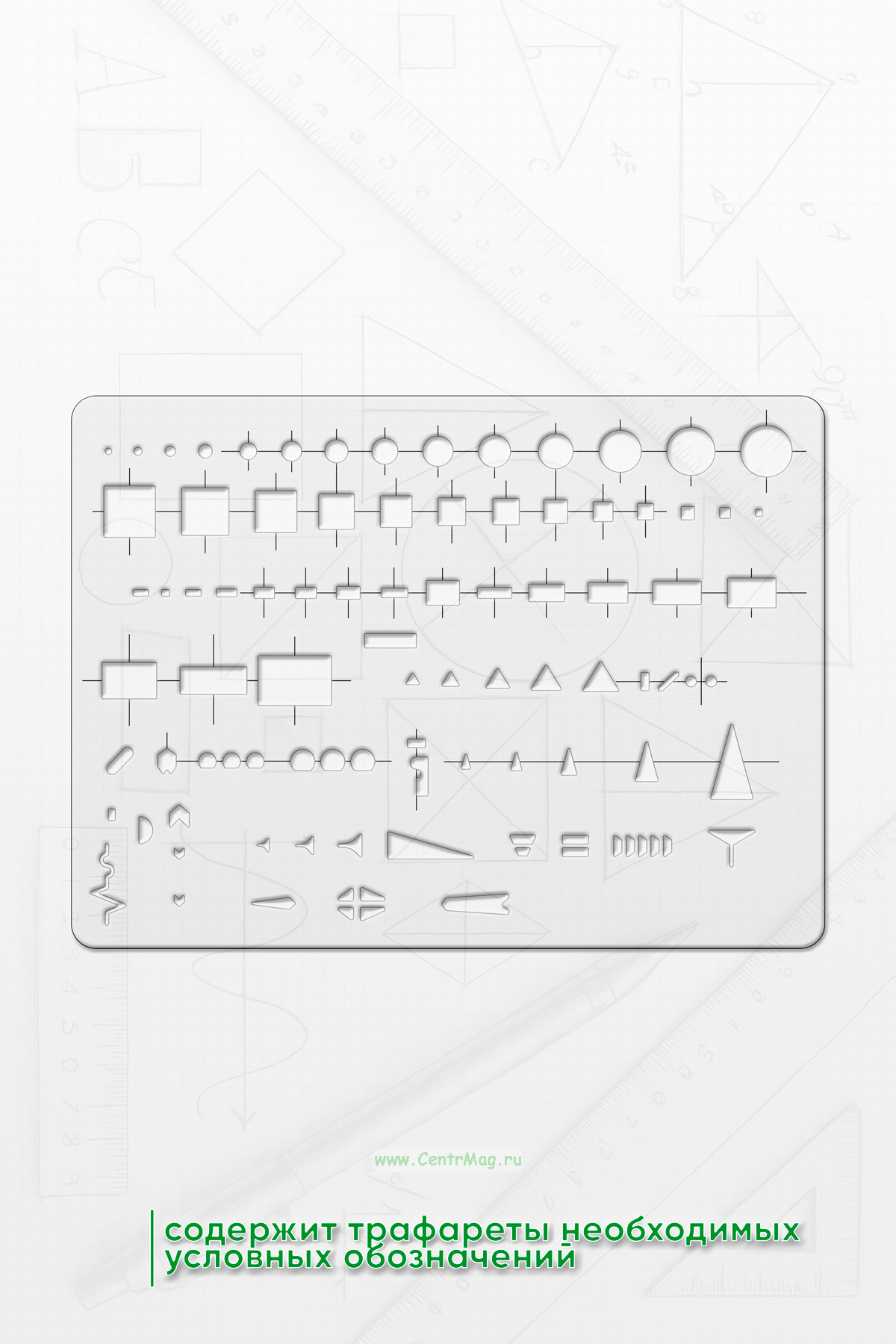 Шаблон для черчения/проектирования содержит трафареты необходимых условных обозначений. Изготовлен из прозрачного пластика.