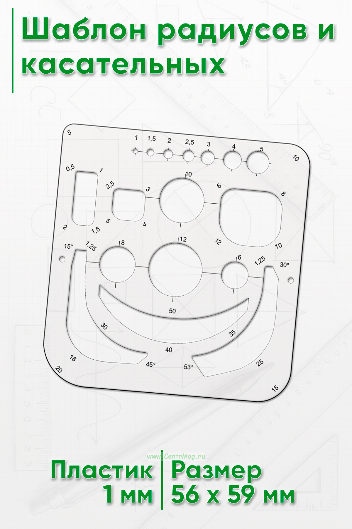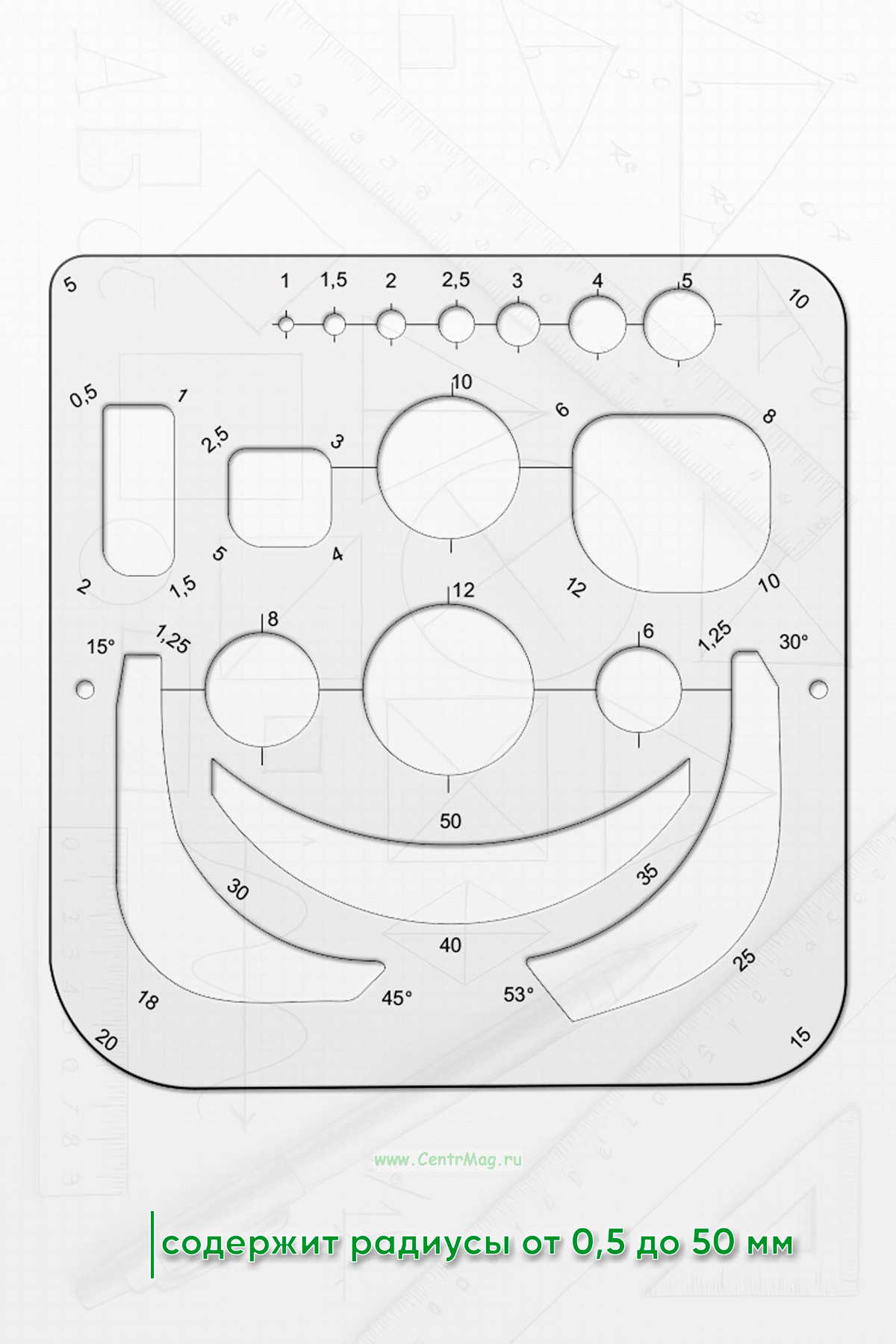 Шаблон радиусов и касательных содержит радиусы от 0,5 до 50 мм.