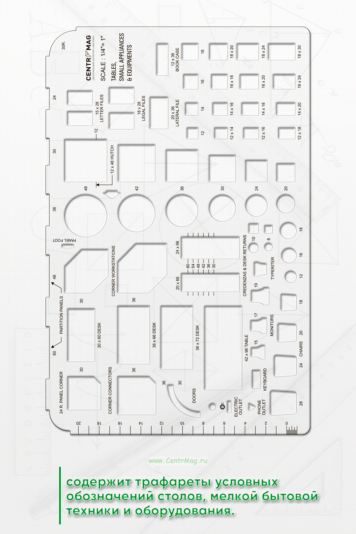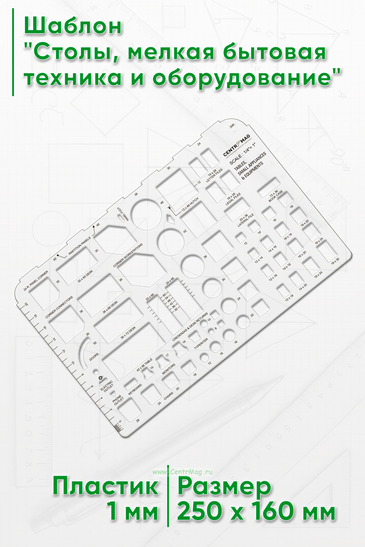 Шаблон для черчения/проектирования содержит трафареты условных обозначений столов, мелкой бытовой техники и оборудования.