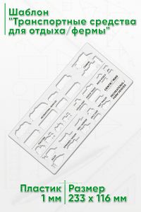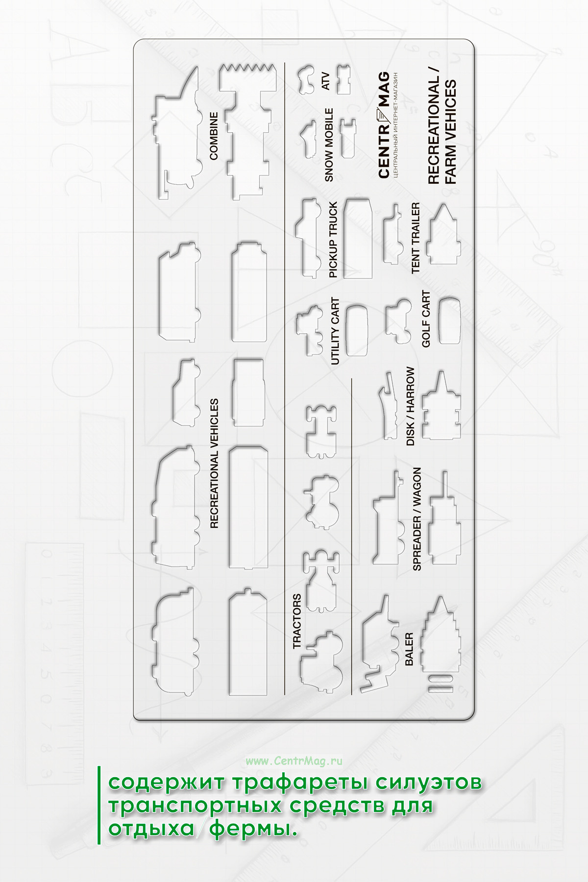 Шаблон для черчения/проектирования содержит трафареты силуэтов транспортных средств для отдыха/фермы.
