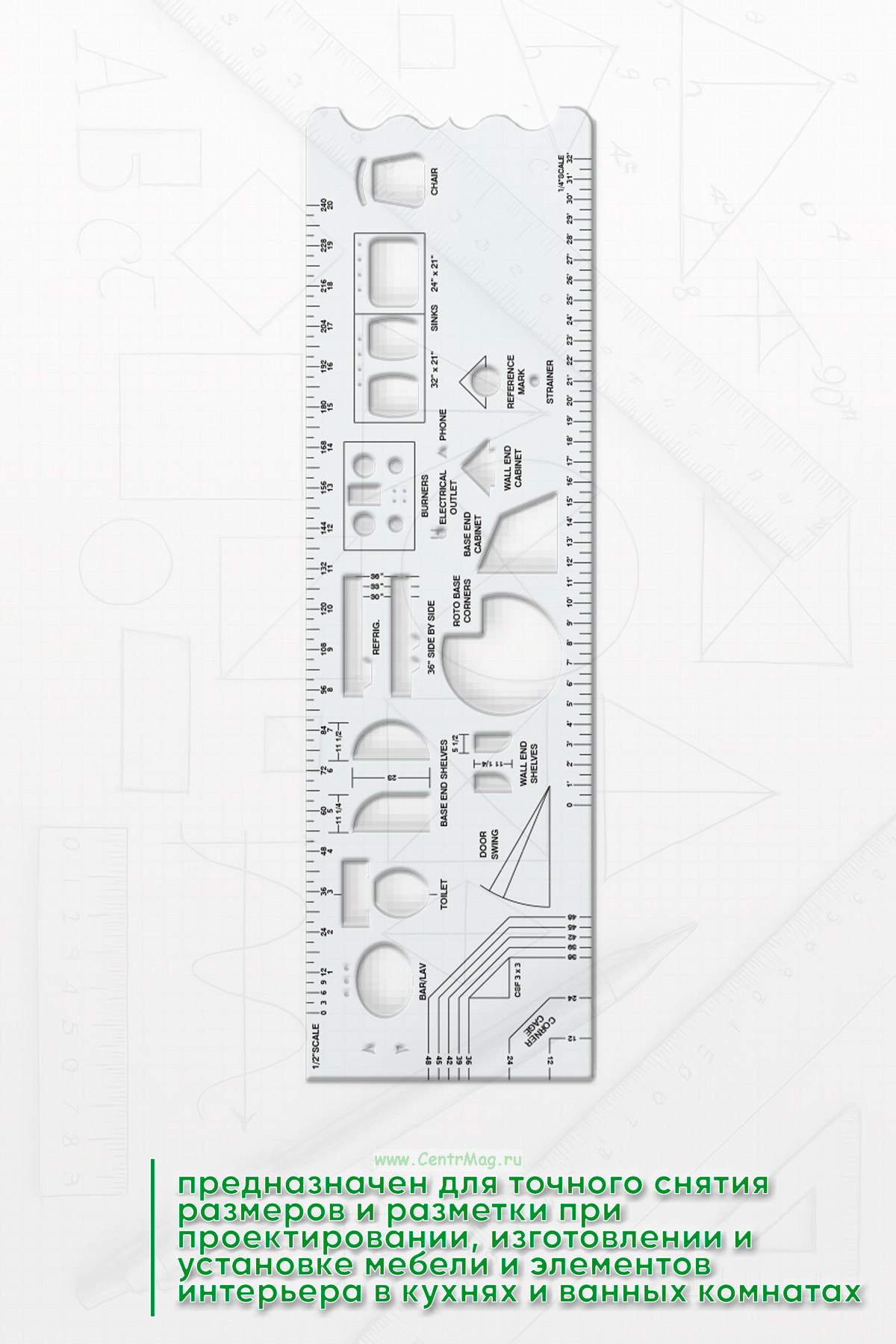 Шаблон "Кухня и ванна" — это специализированный инструмент или образец, используемый для точного снятия размеров и создания контуров при изготовлении и установке мебели и элементов интерьера в кухнях и ванных комнатах.