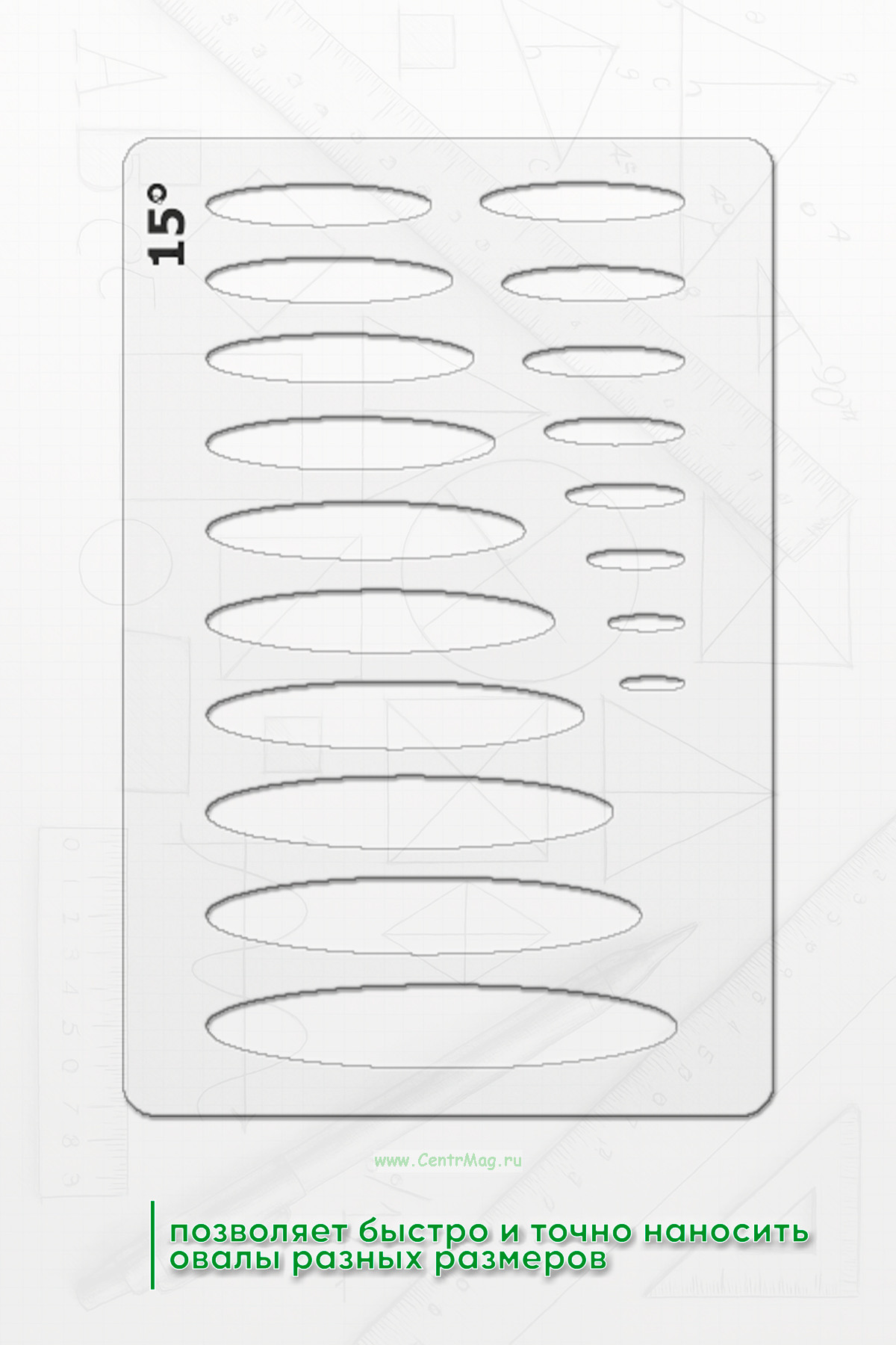 Шаблон позволяет быстро и точно наносить овалы разных размеров. Этот шаблон позволяет пользователю размещать его на любой поверхности и рисовать точные фигуры.