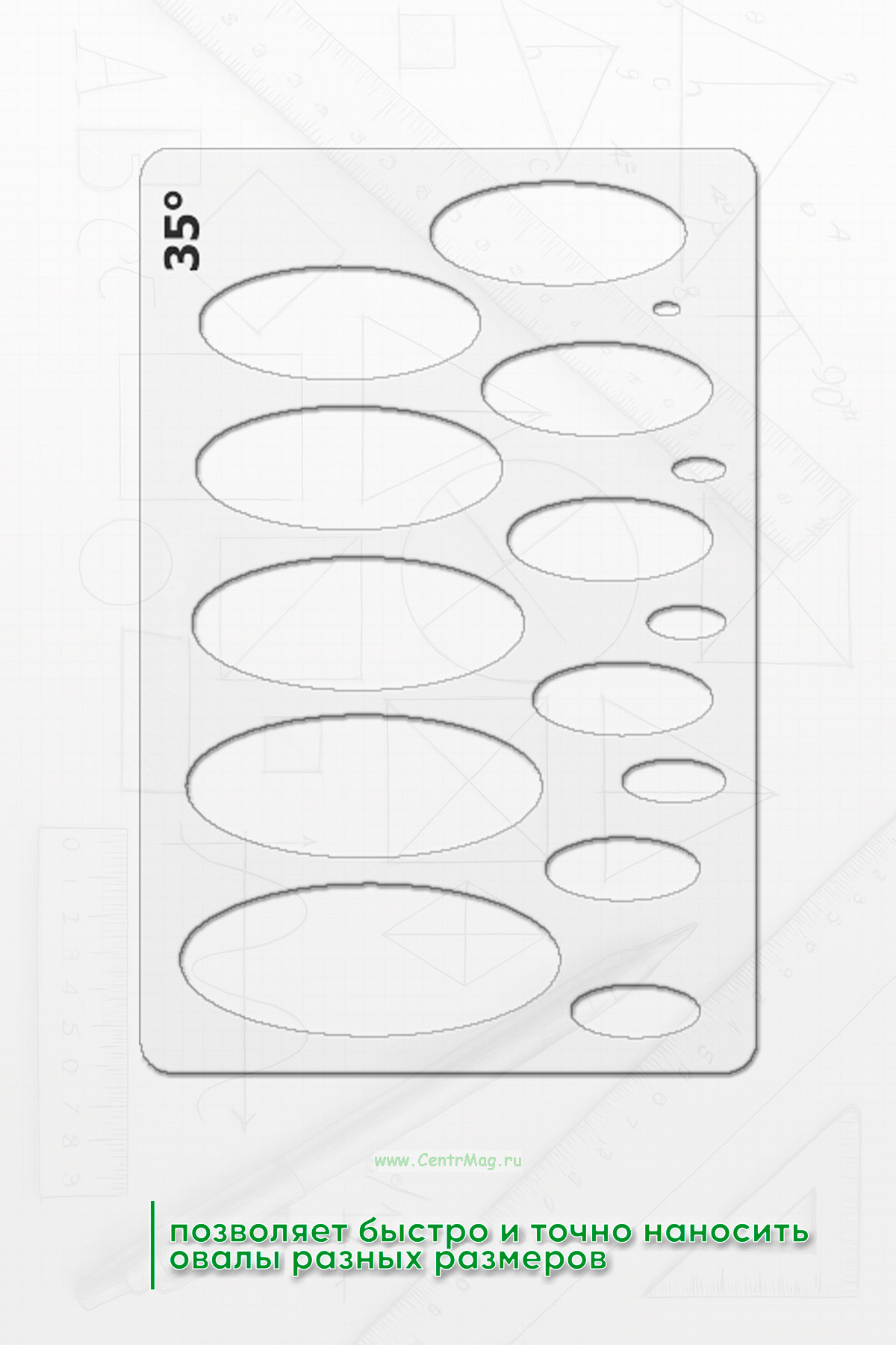 Шаблон позволяет быстро и точно наносить овалы разных размеров. Этот шаблон позволяет пользователю размещать его на любой поверхности и рисовать точные фигуры.