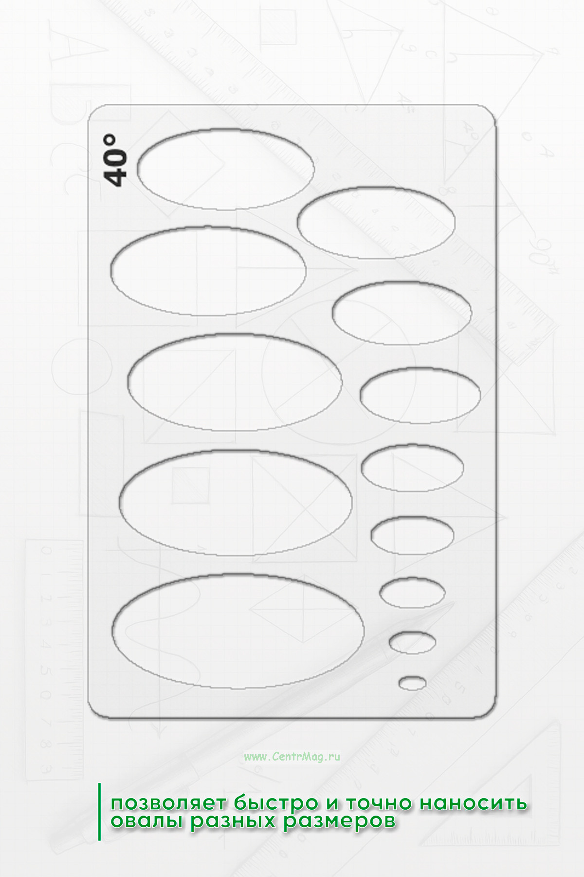 Шаблон позволяет быстро и точно наносить овалы разных размеров. Этот шаблон позволяет пользователю размещать его на любой поверхности и рисовать точные фигуры.
