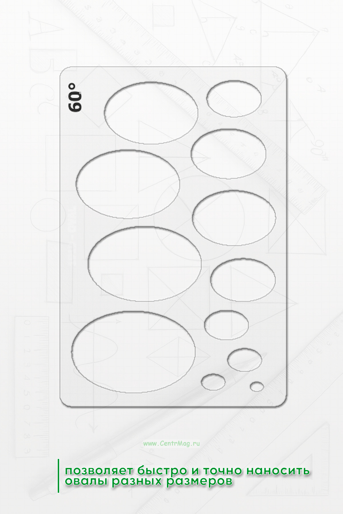 Шаблон позволяет быстро и точно наносить овалы разных размеров. Этот шаблон позволяет пользователю размещать его на любой поверхности и рисовать точные фигуры.