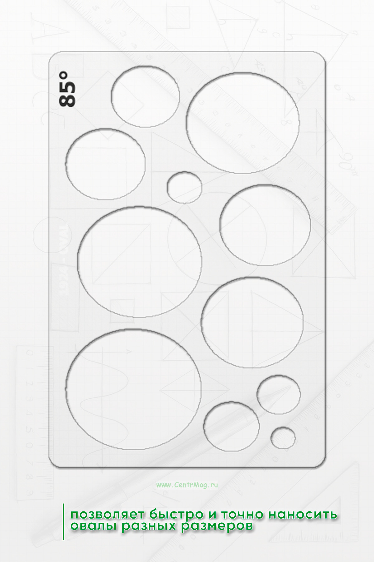 Шаблон позволяет быстро и точно наносить овалы разных размеров. Этот шаблон позволяет пользователю размещать его на любой поверхности и рисовать точные фигуры.