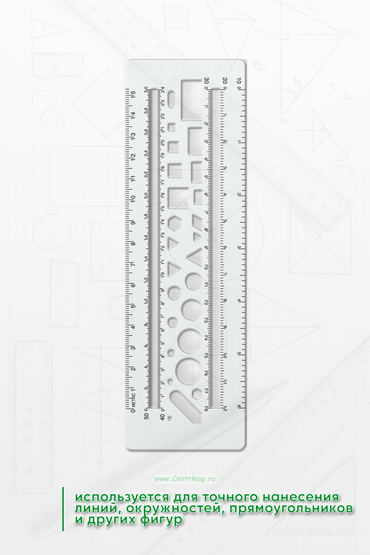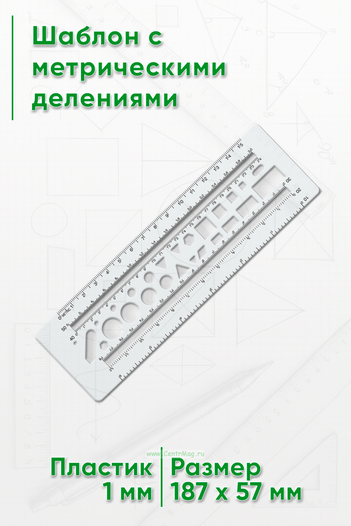 Шаблон с метрическими делениями — это инструмент, с нанесёнными отверстиями, линиями или фигурами, размеченными по метрической шкале.
