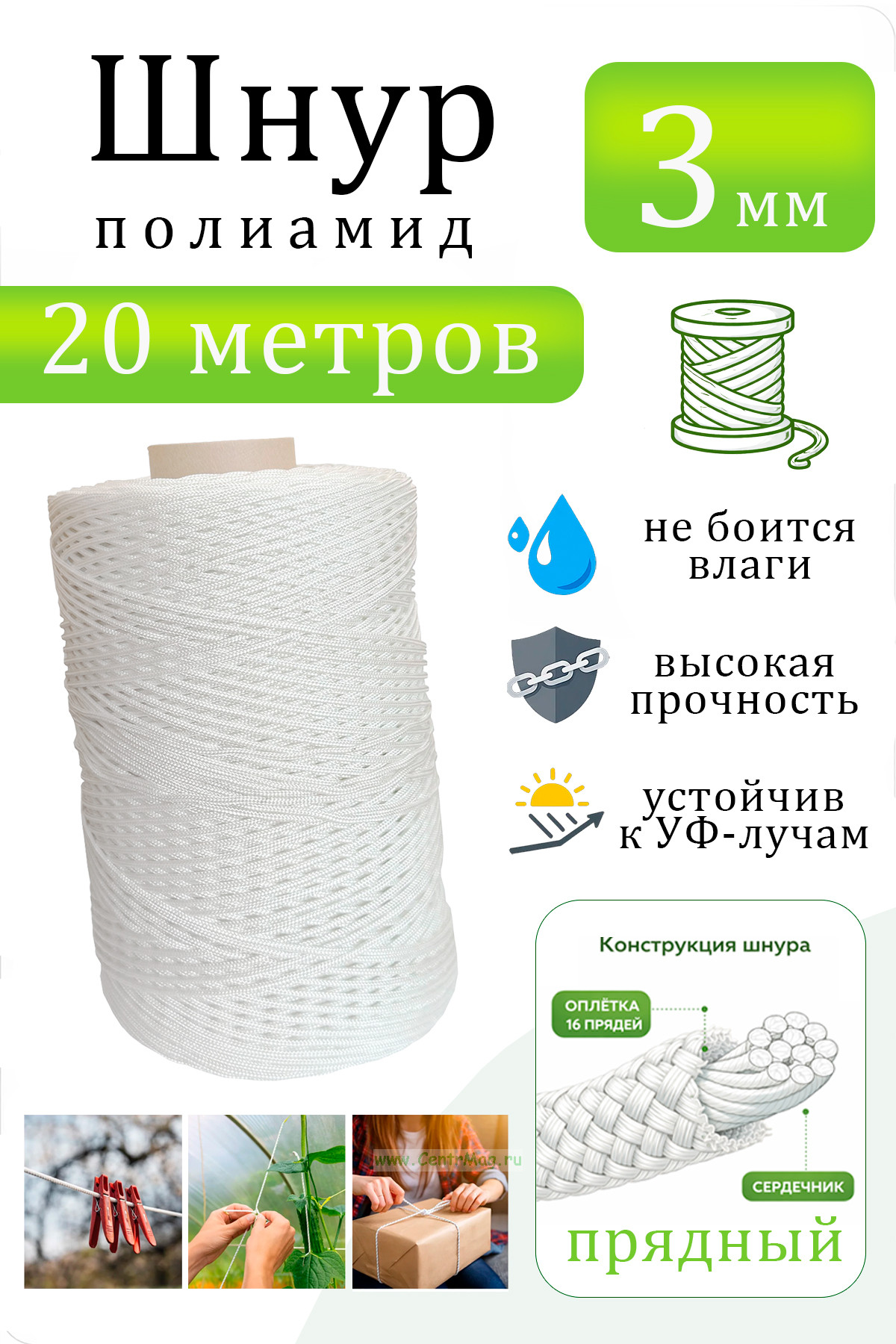 Шнур плетеный полиамидный 16-прядный (3 мм) представляет собой изделие синтетической веревочной продукции. Он выполнен из полиамидных волокон, обладающих превосходными показателями прочности, износостойкости и жесткости. В отличие от крученых изделий шнур имеет в своем составе сердечник и оплетку из 16 прядей, которая придает ему эстетичный внешний вид, повышает разрывную нагрузку и в целом улучшает его эксплуатационные свойства.
