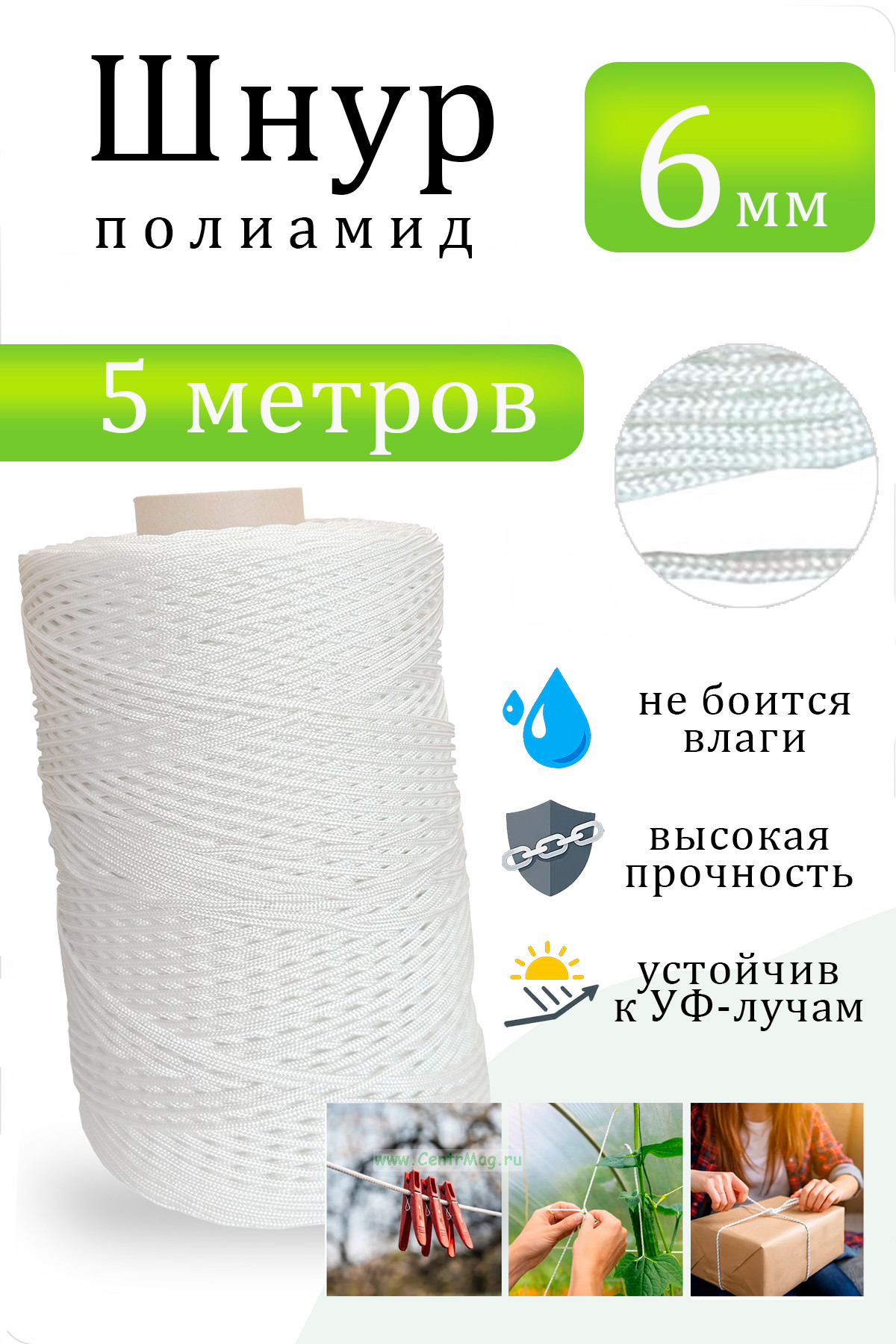 Шнур применяется для крепления и фиксации грузов, подвязки и растяжки конструкций, в строительных и монтажных работах, туризме, рыбалке, садовых и хозяйственных работах. Также подходит для использования в кемпинге, при установке тентов, палаток и навесов.