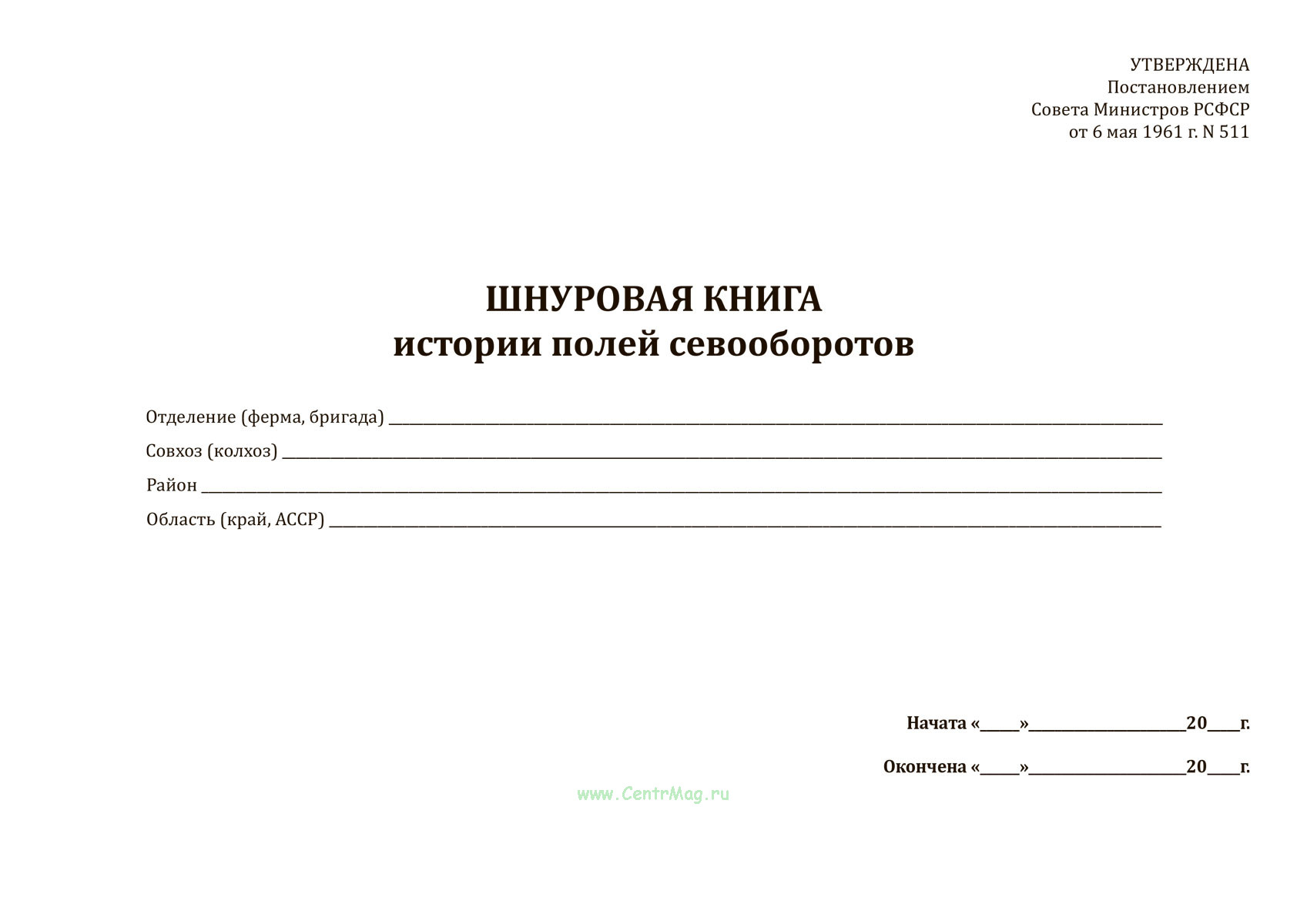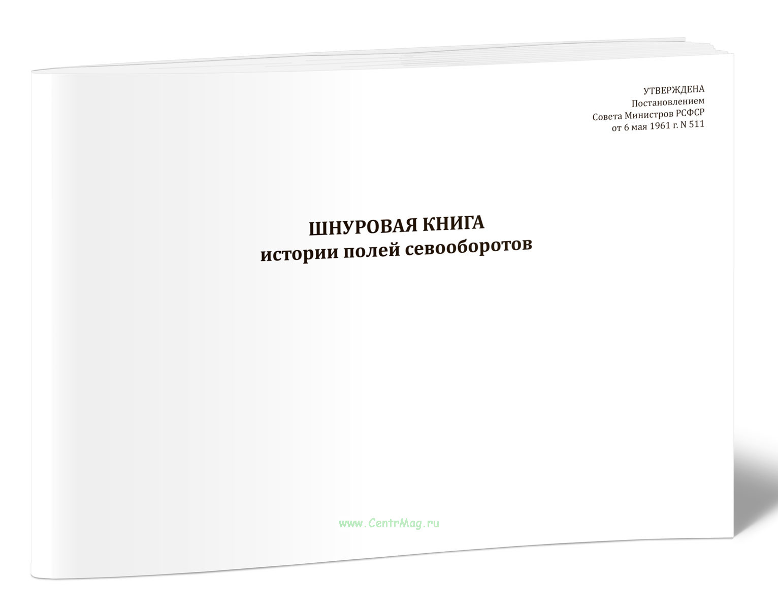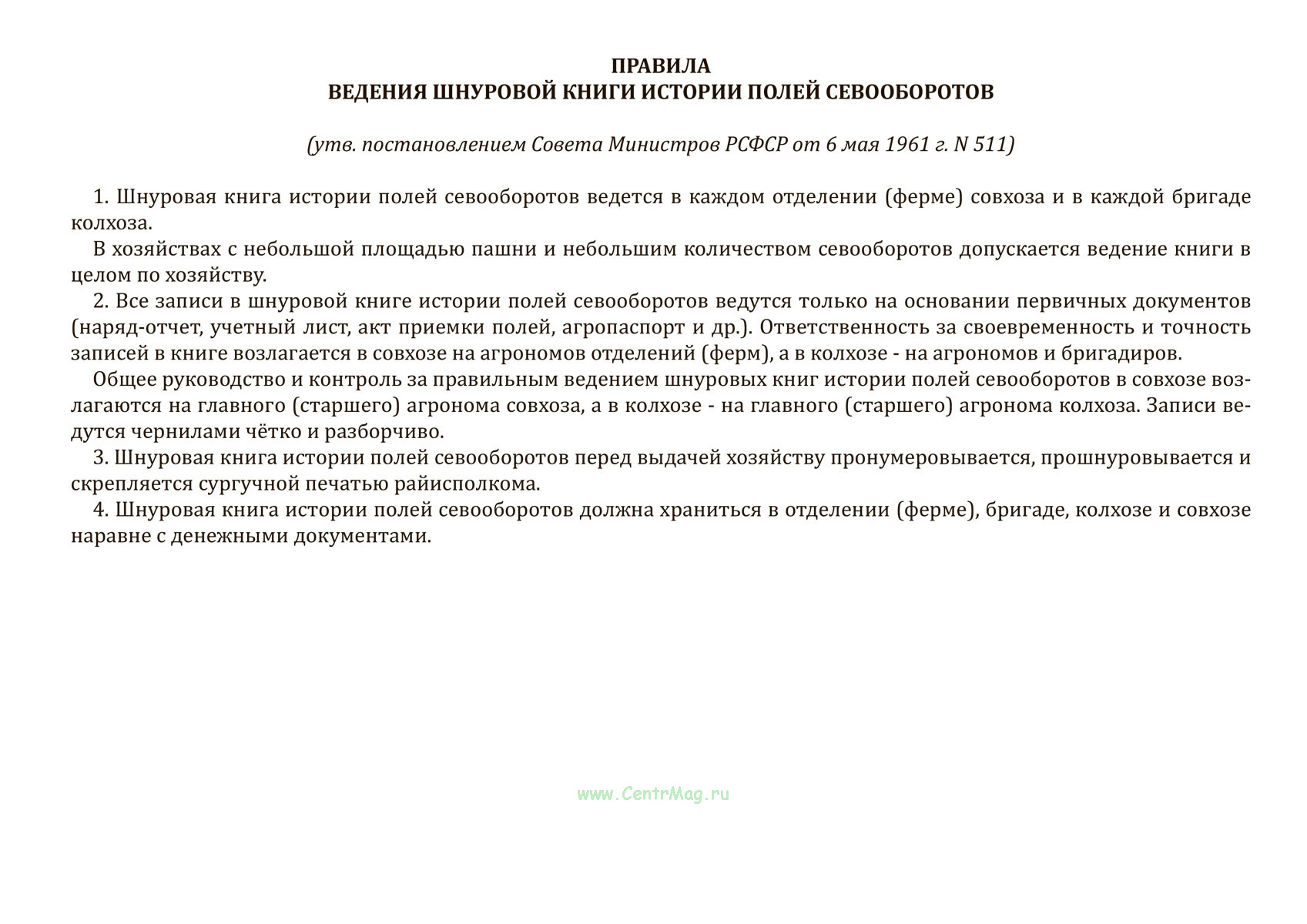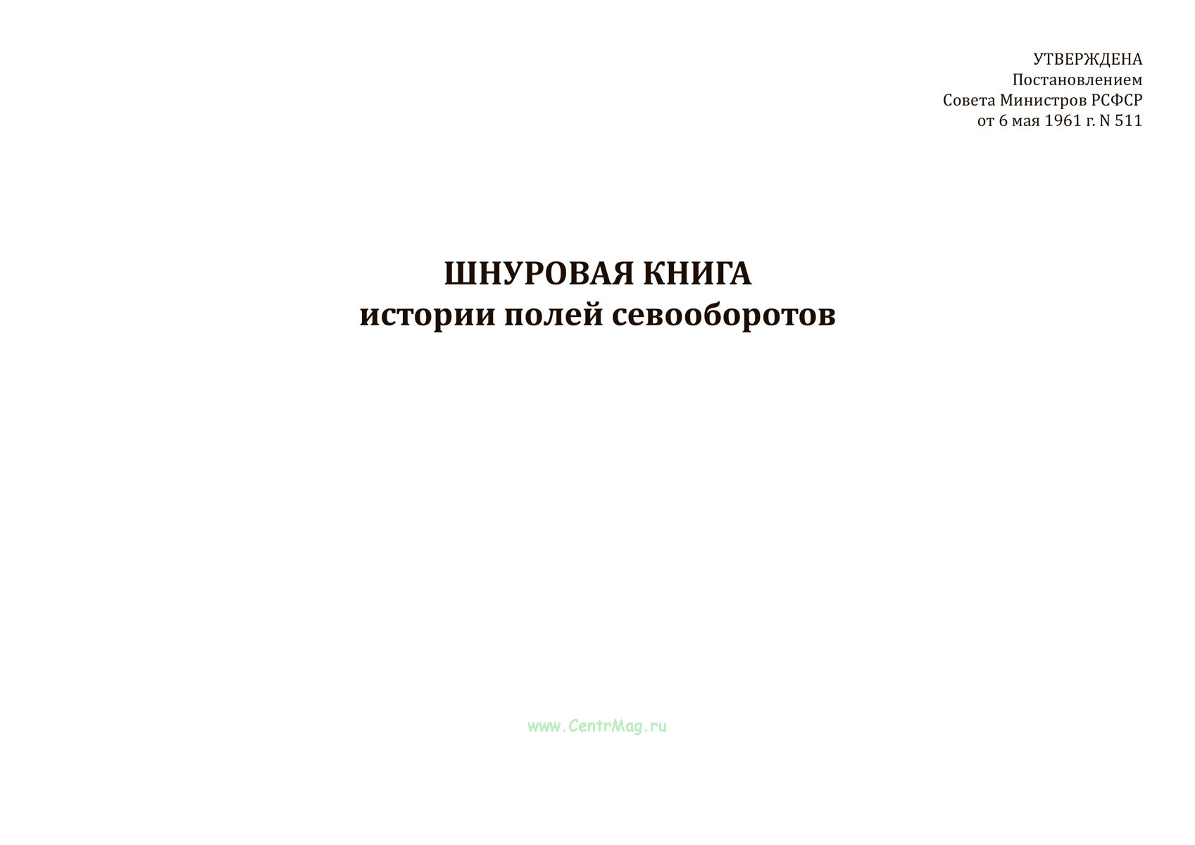 Форма Шнуровой книги истории полей севооборотов утверждена Постановлением Совета Министров РСФСР от 6 мая 1961 г. N 511, которое утратило силу с 01.02.2020 в связи с изданием Постановления Правительства РФ от 13.01.2020 N 7