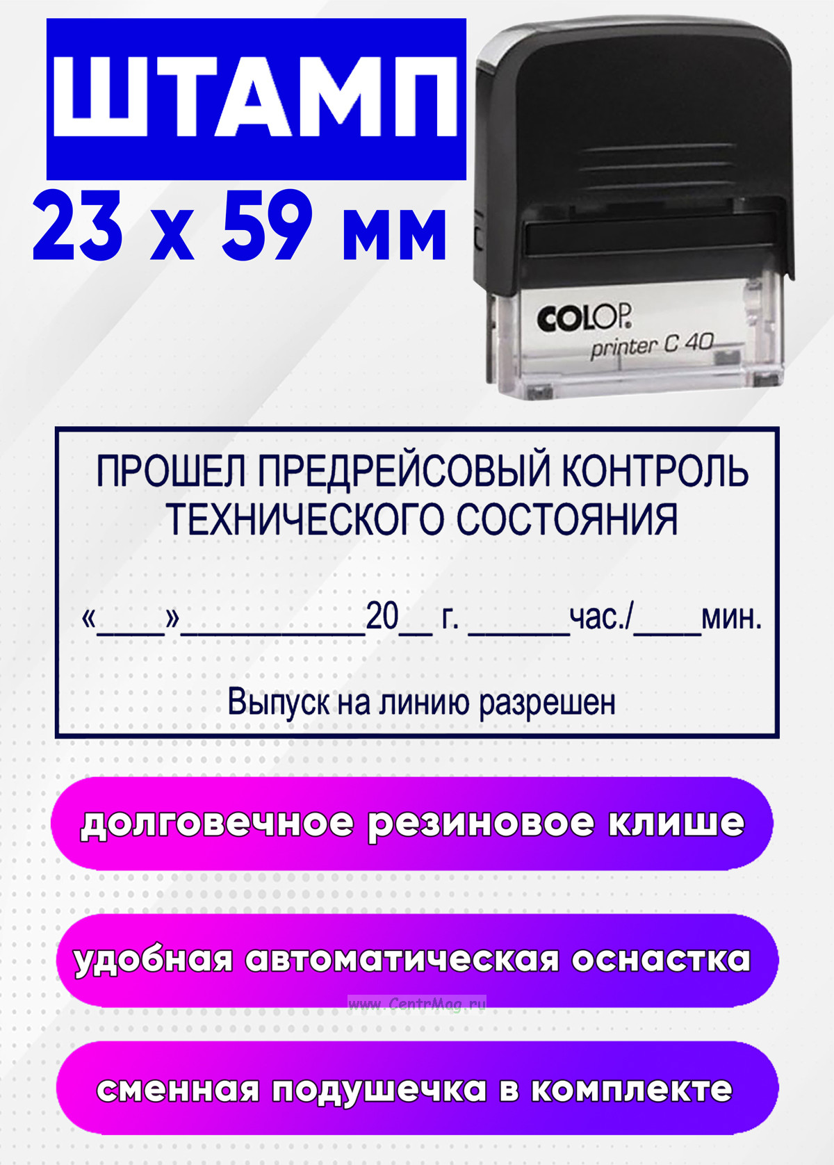 Штамп "Прошел предрейсовый контроль технического состояния. Выпуск на линию разрешен", 23 x 59 мм