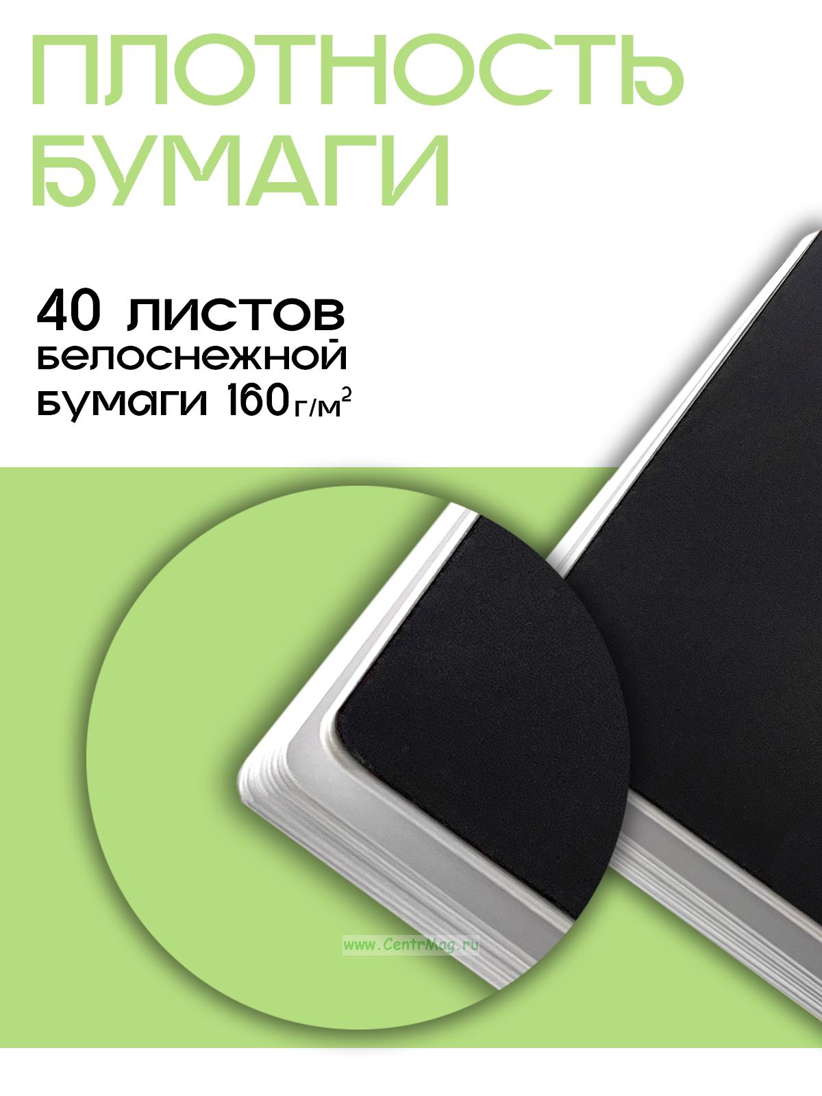 Скетчбук без линовки с плотными листами. На обложке изображен красивый рисунок, а обратная сторона обложки сделана из черного картона. 40 листов высококачественной белоснежной бумаги плотностью 160 г/м2.
