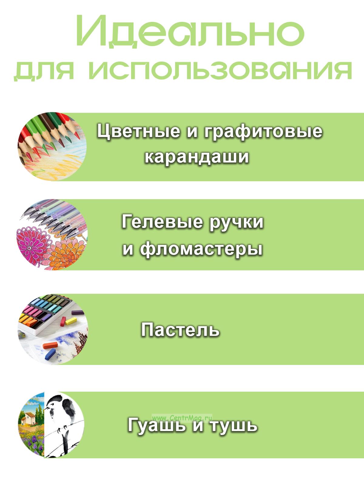 Металлическая пружина позволяет удобно раскрывать блокнот на 360°. Рисовать в творческом блокноте можно фломастерами, карандашами, тушью, пастельными мелками или красками.