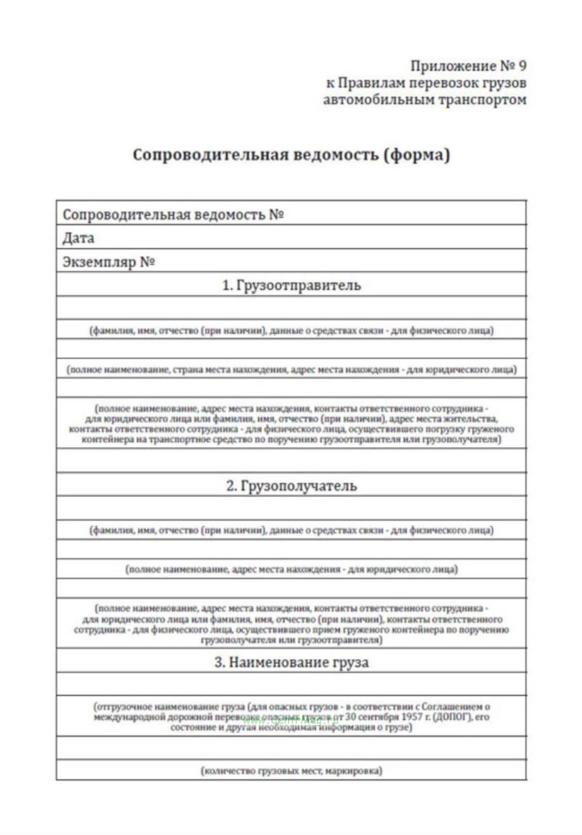 Форма сопроводительной ведомости соответствует Приложению 9 к Постановлению Правительства РФ от 21.12.2020 N 2200 "Об утверждении Правил перевозок грузов автомобильным транспортом и о внесении изменений в пункт 2.1.1 Правил дорожного движения Российской Федерации"