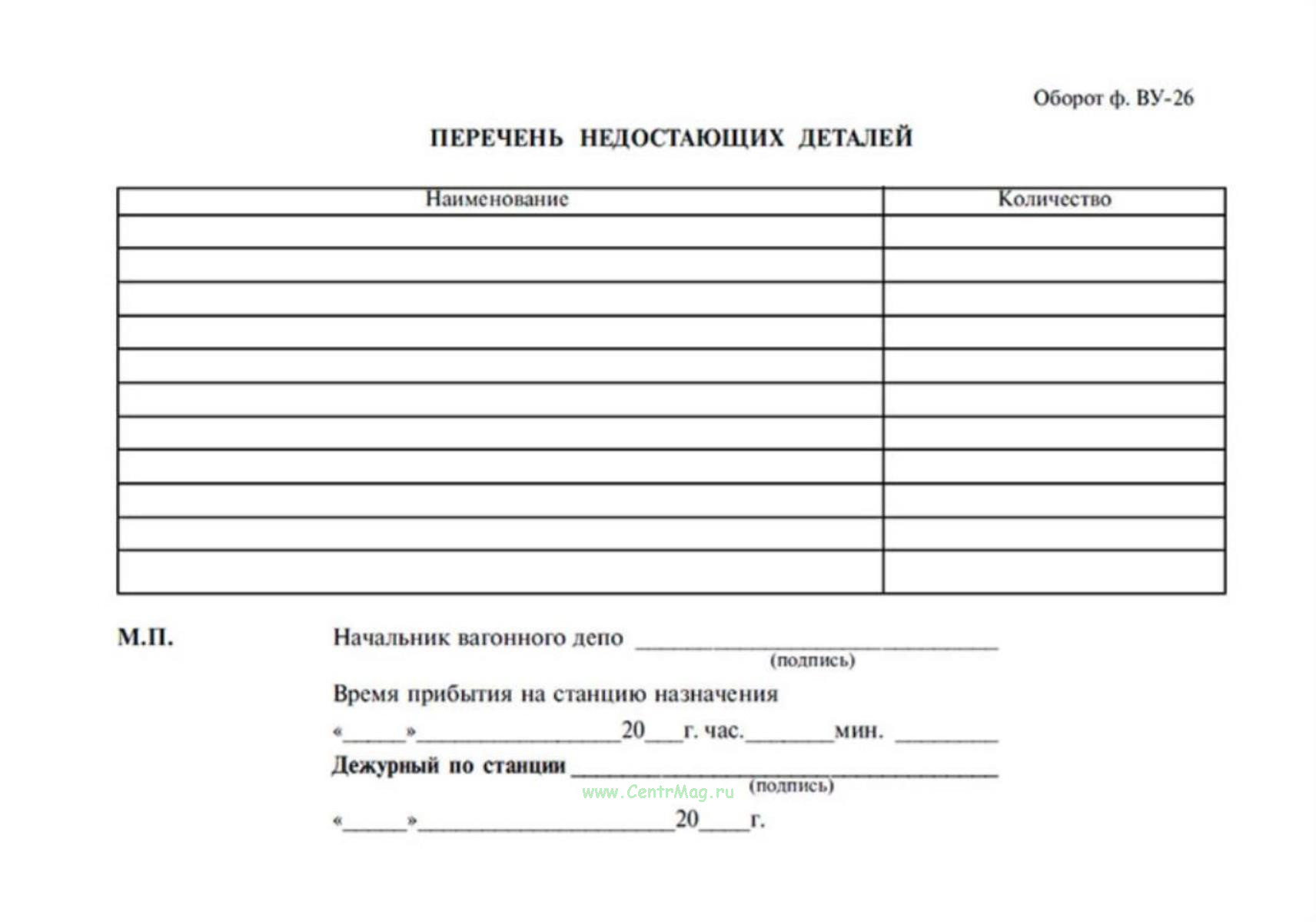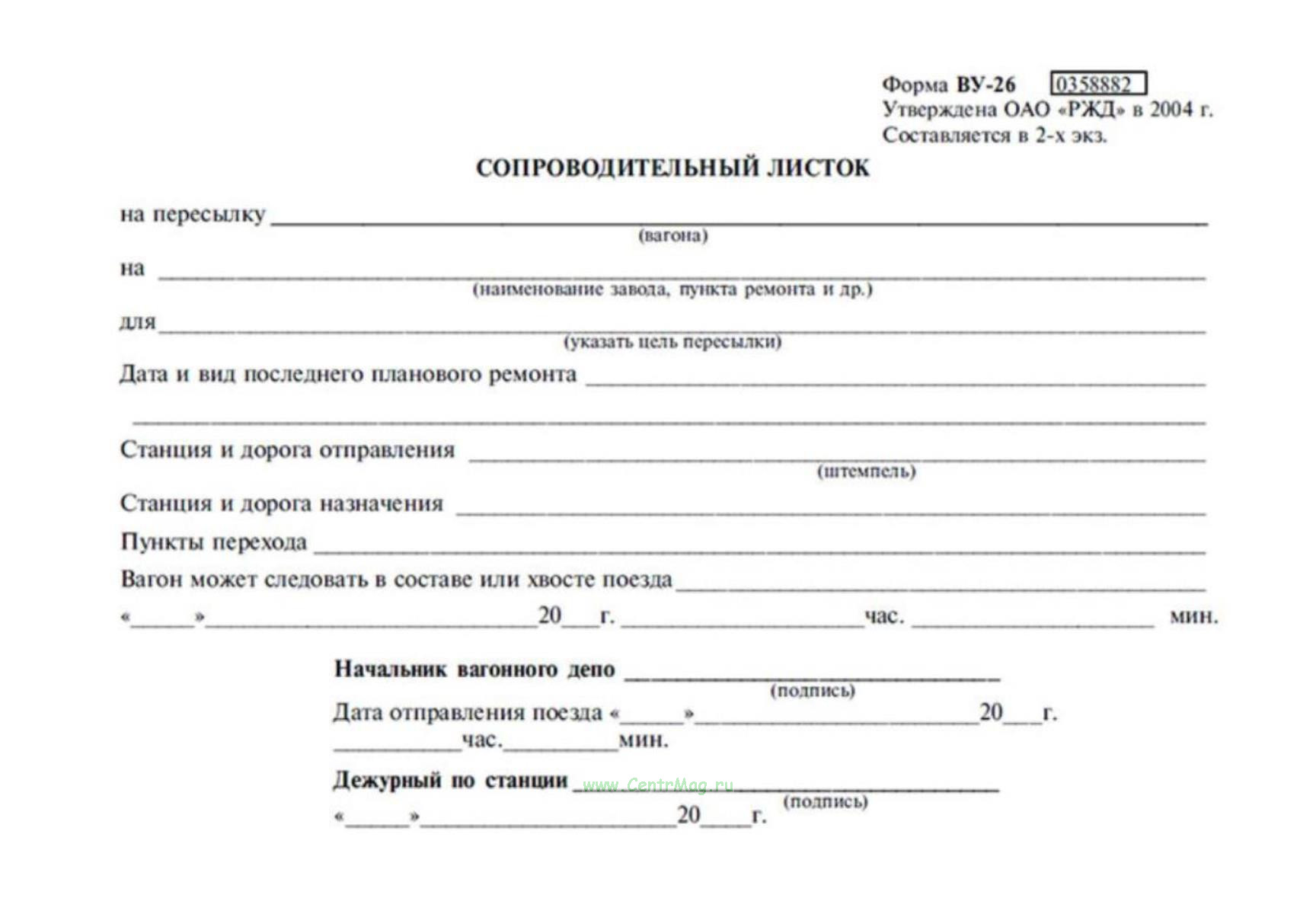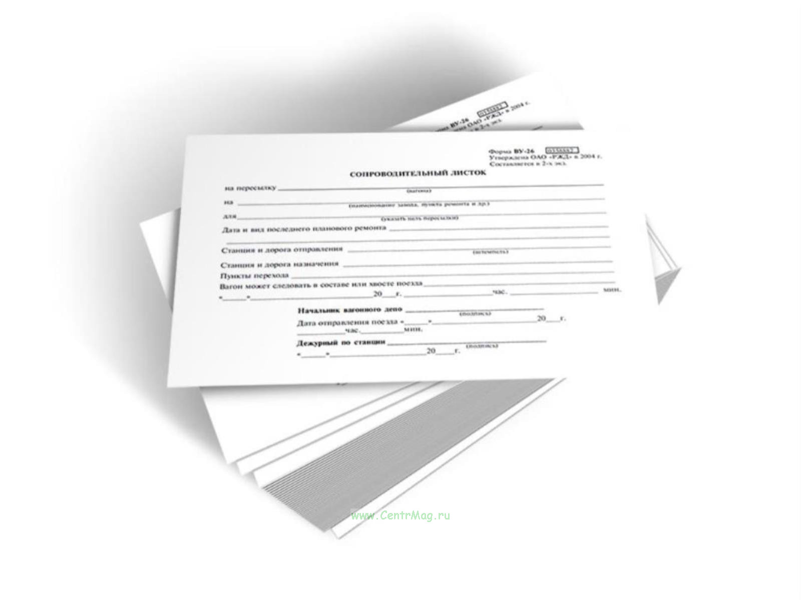 Сопроводительный листок формы ВУ-26 является документом, разрешающим пересылку неисправного грузового или пассажирского вагона, рефрижераторного поезда (секции), хоппер-дозаторной или думпкарной вертушки в ремонт, а также для укрупненного технического обслуживания автономного рефрижераторного вагона, для ремонта и пополнения недостающего внутреннего оборудования ледника, для направления неисправного вагона на промывку, пропарку, нейтрализацию. Выдается во всех случаях пересылки вагонов в ремонт, в том числе на заводы, вагонные и локомотивные депо, механизированные вагоноремонтные пункты, на промывочно-пропарочные предприятия я предприятия нейтрализации; из одного ремонтного пункта в другой; с промежуточных станций до ближайшего ремонтного пункта; с места отстоя пассажирских вагонов и т. д.