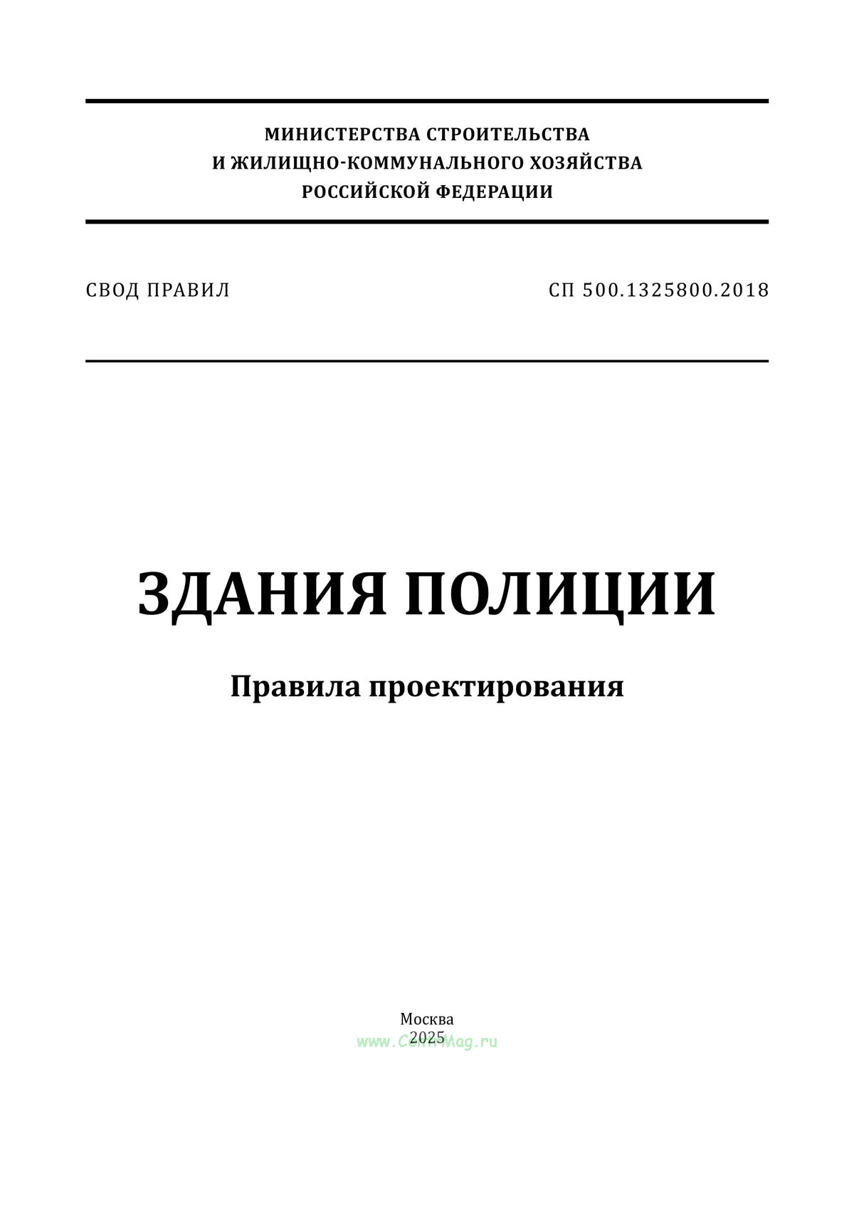"СП 500.1325800.2018. Свод правил. Здания полиции. Правила проектирования" утвержден и введен в действие приказом Министерства строительства и жилищно-коммунального хозяйства Российской Федерации от 17 января 2018 г. N 19/пр и введен в действие с 18 июля 2018 г.